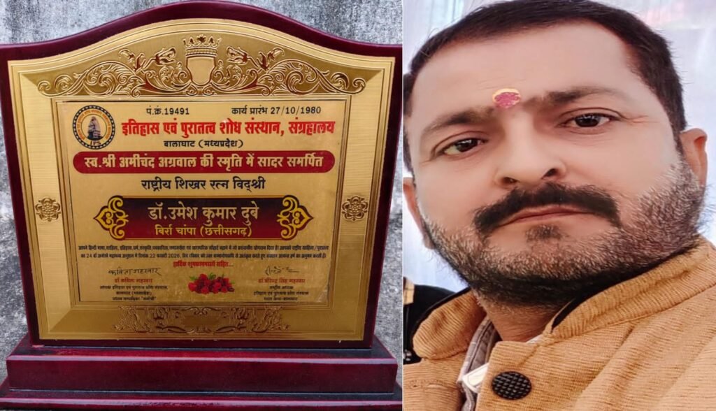 बिर्रा -इतिहास एवं पुरातत्व शोध संस्थान संग्रहालय बालाघाट (मध्य प्रदेश)तथा स्वर्गीय श्री अमीचंद अग्रवाल की स्मृति के संयुक्त तत्वाधान में पुण्य सलिला वैन गंगा के तट पर बसा बालाघाट चर्चित नगर जहां राष्ट्रीय साहित्य एवं पुरातत्व का 24 वां अनोखा महाभव्य अनुष्ठान सहयोगात्मक रूप से सादगी पूर्वक आयोजित हुआ।उक्त अवसर पर कई राज्यों से प्रतिष्ठित साहित्य विद,इतिहास विद,समाज शास्त्री,पत्रकार उपस्थित हुए।शिक्षक डॉ उमेश कुमार दुबे जिन्होंने अपने जीवन में दीर्घकाल तक विभिन्न प्रकार के सांस्कृतिक,पर्यावरण हिंदी भाषा,साहित्य,इतिहास धर्म,संस्कृति,पत्रकारिता समाज सेवा एवं पारस्परिक सौहार्द बढ़ाने व अन्य रचनात्मक कार्यों को संपादित करने में अभूतपूर्व वृद्धि करके विशालतम रूप से शासन प्रशासन,जन समूह में ध्यानाकर्षण का केंद्र बनाया है।डॉ उमेश कुमार दुबे अपनी इच्छा तपोबल से संपूर्ण योजनाओं को समय पूर्व ही क्रियान्वयन करने में सफलता अर्जित कर गौरवान्वित किया है।जिसके कारण राष्ट्रीय साहित्य पुरातत्व के 24 वां महाभव्य अनुष्ठान में इतिहास एवं पुरातत्व शोध संस्थान संग्रहालय के राष्ट्रीय अध्यक्ष डॉ वीरेंद्र सिंह गहरवार (इतिहास एवं पुरातत्व शोध संस्थान भारत कैंप बालाघाट) व अध्यक्ष श्रीमती कविता गहरवार (इतिहास एवं पुरातत्व शोध संस्थान प्रधान संपादक गंगोत्री) द्वारा डाकघर के माध्यम (पार्सल) से शिक्षक डॉ उमेश कुमार दुबे को राष्ट्रीय शिखर रत्न विदश्री से सम्मानित किया गया। 1998 में शासकीय आर के उच्चतर माध्यमिक विद्यालय सेमरिया (व्यवस्था के अंतर्गत सहायक शिक्षक विज्ञान) से कैरियर शुरू कर शिक्षाकर्मी वर्ग 3,प्रभारी प्राचार्य शासकीय आर के उत्तर माध्यमिक विद्यालय सेमरिया,सहायक शिक्षक पंचायत, शिक्षक एलबी,पीएलसी प्रभारी, राष्ट्रीय आईडियाज जिला प्रभारी,स्वीकृति मंच,गढबो नवा छत्तीसगढ़,ब्लॉक मीडिया प्रभारी,जिला मीडिया प्रभारी समग्र शिक्षा जांजगीर चांपा से लेकर वर्तमान में प्रभारी प्रधान पाठक तक की यात्रा में उमेश कुमार दुबे ने हर पद पर अपनी गरिमा बनाई। आज वह एक आदर्श शिक्षक के रूप में पहचाने जाते हैं। उमेश कुमार दुबे का राष्ट्रीय शिखर रत्न विदश्री यह सम्मान न केवल उनकी व्यक्तिगत उपलब्धि है बल्कि ग्रामीण शिक्षा के क्षेत्र में एक नई सोच और सकारात्मक बदलाव की पहचान है उन्हें मिलने वाला या सम्मान उन सभी शिक्षकों के लिए प्रेरणा है जो शिक्षा को केवल नौकरी नहीं बल्कि सेवा मानते हैं शिक्षक उमेश कुमार दुबे को पहले भी कई अवसरों पर सामाजिक स्तर स्थानीय स्तर,संकुल, विकासखंड स्तर पर श्रेष्ठ शिक्षक एवं उत्कृष्ट पीएलसी सम्मान,जिला स्तर पर प्रभारी मंत्री व कलेक्टर द्वारा मुख्यमंत्री 