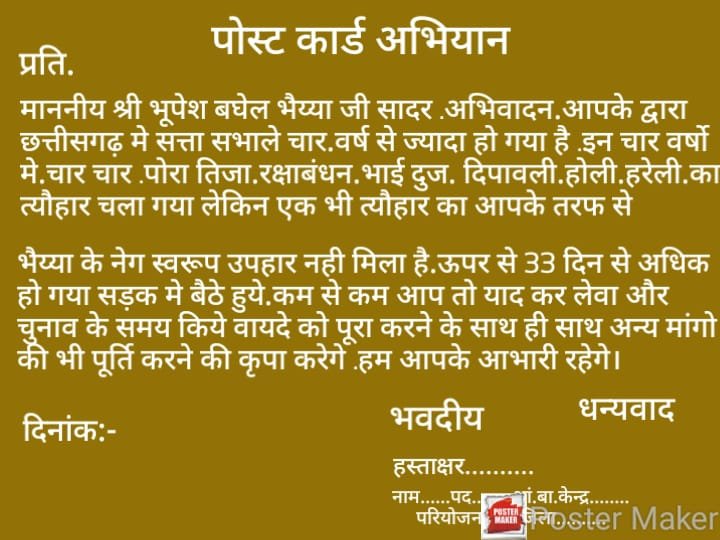 इसी प्रकार मुख्यमंत्री के नाम पोस्टकार्ड अभियान में लिखा है कि आपके द्वारा छत्तीसगढ़ में सत्ता संभालर चार वर्षों से ज्यादा हो गए हैं इन चार वर्षों में चार-चार पोरा तीजा रक्षाबंधन भाई दूज दीपावली होली हरेली का त्यौहार चला गया लेकिन एक भी त्यौहार का आपके तरफ से भेँट स्वरूप उपहार नहीं मिला है ऊपर से 34 दिन से अधिक हो गए सड़क में बैठे हुए कम से कम आप तो याद कर लेवे और चुनाव के समय किए वायदे को पूरा करने के साथ ही साथ अन्य मांगों की पूर्ति करने की कृपा करेंगे।उक्त अभियान में अध्यक्ष रीता वस्त्रकार दुर्गा मंडावी प्रीति साहू जमुना महावे खिलेश्वरी टांडिया ओम लता सोनी कौशल्या दुग्गा राधिका गनेशा उमा हीरोतीन विश्वासा के साथ समस्त आंगनबाड़ी कार्यकर्ता व सहायिकाओं ने पत्र लिखा।