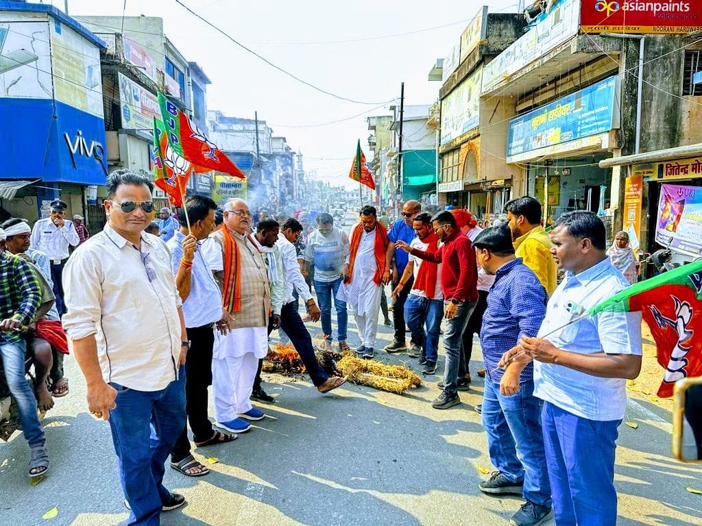कांकेर। भारतीय जानता युवा मोर्चा प्रदेश आवाहन पर मंडल अध्यक्ष घनेंद्र सिंह ठाकुर की नेतृत्व में आक्रोश पुतला दहन किया है। मंडल अध्यक्ष घनेंद्र सिंह ठाकुर ने कहा रेत माफियाओ को मिल रहे संरक्षण का परिणाम भाजयूमो भैयाथान मंडल के अध्यक्ष भाई अमन प्रताप पर जानलेवा हमला हुआ। पैरो पर गाड़ी चढ़ा दी गयी सर पर लोहे की रॉड से मारा इतनी निर्ममता से हमले का बल आखिर किस्से मिला अपराधियो को , छत्तीसगढ़ की कांग्रेस सरकार लगातार प्रदेश को अपराधगढ़ बना रही है। अपराधियो को कड़ी सजा मिलनी चाहिए। और भगवान से प्राथना है भाई जल्द स्वस्थ होकर घर लौटे।कार्यक्रम मे मुख्य रूप से भरत मटियारा देवेन्द्र बाऊ, टेकेश्वर जैन, भूपेन्द्र नाग, आशाराम नेताम, मंडल अध्यक्ष दीपक खटावनी, गिरधर यादव, पप्पू मोटवानी, संजय सोनी, गोलू तिवारी, आशीष मनीष जैन, भानु नेताम, पीयूष वलेचा, मोनू यादव, जतिन अटभिया, दीपांशु जैन, योगेश कृष्णा, पांडेय राजपूत, सुनील ठाकुर, पीयूष बैरागी, शिवम् जयसवाल, नवीस रजक, किशोर बलराम यादव, बिट्टू बघेल उपस्थित रहे।