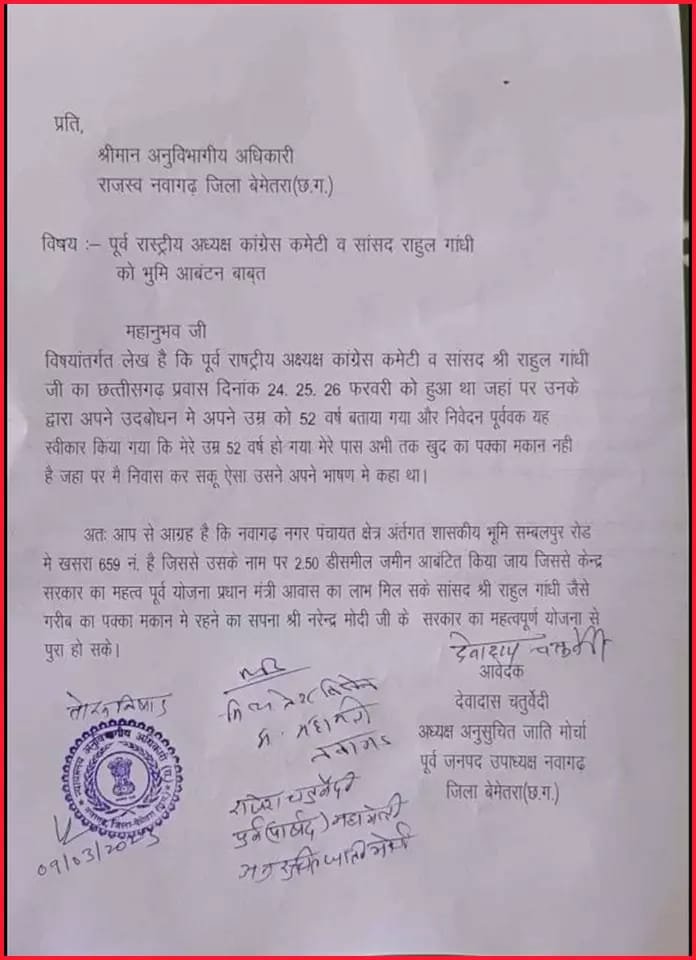 दरअसल भूमि आवंटित करने अनुविभागीय अधिकारी को देवादास चतुर्वेदी ने पत्र लिखा है. लेटर में ये उल्लेख है कि पूर्व राष्ट्रीय अध्यक्ष कांग्रेस कमेटी व सांसद राहुल गांधी का छत्तीसगढ़ प्रवास दिनांक 24. 25. 26 फरवरी को हुआ था जहां पर उनके द्वारा अपने उदबोधन मे अपने उम्र को 52 वर्ष बताया गया और निवेदन पूर्ववक यह स्वीकार किया गया कि मेरे उम्र 52 वर्ष हो गया मेरे पास अभी तक खुद का पक्का मकान नही है जहा पर मै निवास कर सकू ऐसा उसने अपने भाषण में कहा था।