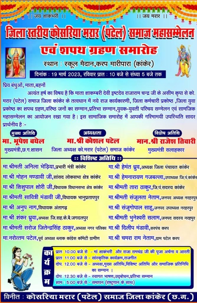 कोसरिया मरार पटेल समाज के जिला अध्यक्ष कौशल पटेल ने बताया कि समय के अनुरूप हमारा समाज एकता के सूत्र में बंध कर सामाजिक उत्थान की ओर निरंतर अग्रसर होगा समाज का आग्रह स्वीकार करते हुए मुख्यमंत्री बघेल हमारे आयोजन में अपनी गरिमामयी उपस्थित प्रदान करने हमारे आयोजन में पधार रहे हैं इस बात का हमारा समाज कृतघ्न रहेगा ।