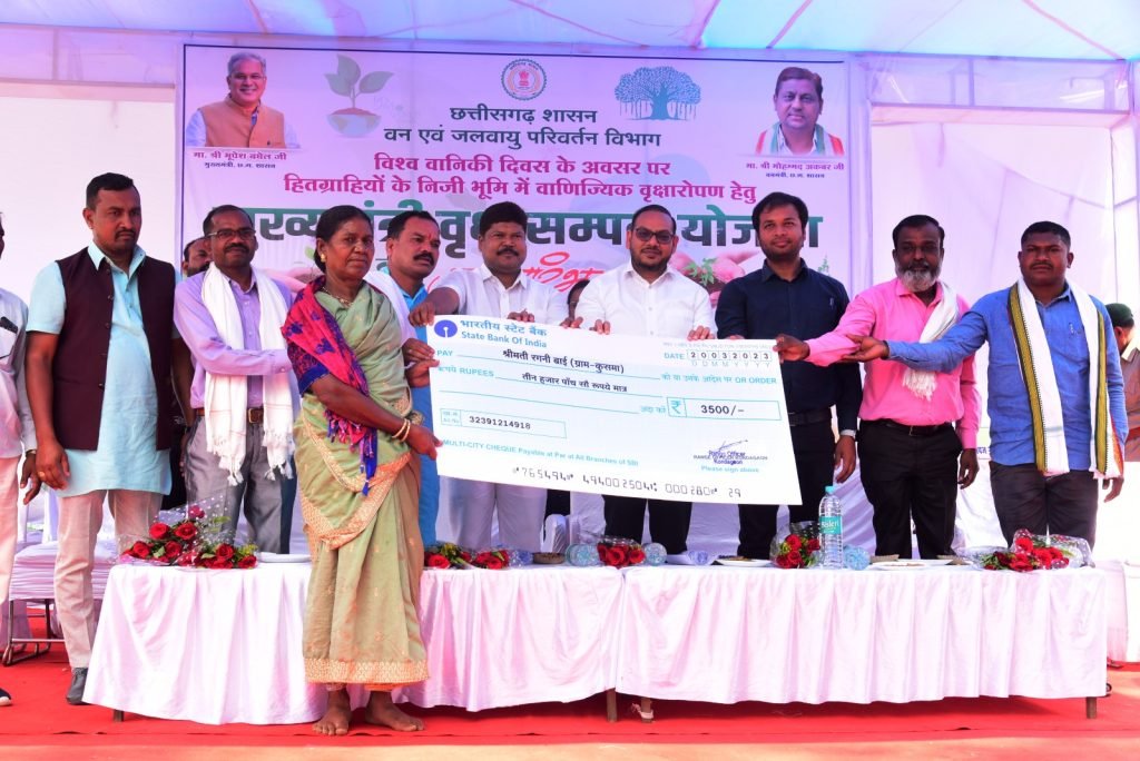 जिले के उत्तर कोण्डागांव वनमण्डल के अंतर्गत विश्व वानिकी दिवस पर मुख्यमंत्री वृक्ष सम्पदा योजनांतर्गत 106 हितग्राहियों के 90.35 एकड़ रकबा में टिश्यू कल्चर सागौन एवं बांस के कुल 23310 पौधे रोपित किये गये। कुसमा में आयोजित मुख्यमंत्री वृक्ष सम्पदा योजना शुभारंभ अवसर पर शहीद महेन्द्र कर्मा सामाजिक सुरक्षा योजनांतर्गत तेन्दूपत्ता संग्राहक परिवारों के 09 दावेदारों को कुल 15 लाख 20 हजार रूपये दावा राशि का धनादेश प्रदान किया गया। वहीं मुख्यमंत्री वृक्ष सम्पदा योजनांतर्गत सिंचित पौध रोपण करने वाले 106 हितग्राहियों को अनुदान सहायता राशि का चेक प्रदान किया गया। इस मौके पर अवगत कराया गया कि उत्तर कोण्डागांव वनमण्डल के अंतर्गत मुख्यमंत्री वृक्ष सम्पदा योजना में अब तक कुल 702 हितग्राहियों के 850.85 एकड़ रकबा में विभिन्न प्रजाति के 6 लाख 29 हजार 723 पौधे रोपित किये जाने पंजीयन किया गया है। इस अवसर पर जिला पंचायत अध्यक्ष श्री देवचन्द मातलाम, जनपद पंचायत अध्यक्ष शिवलाल मण्डावी, जनपद पंचायत उपाध्यक्ष मनोज सेठिया, जिला वनोपज सहकारी यूनियन के अध्यक्ष धनसूराम नेताम सहित क्षेत्र के जनप्रतिनिधी और डीएफओ आरके जागड़े तथा वनविभाग के अधिकारी-कर्मचारी एवं बड़ी संख्या में ग्रामीणजन मौजूद थे।