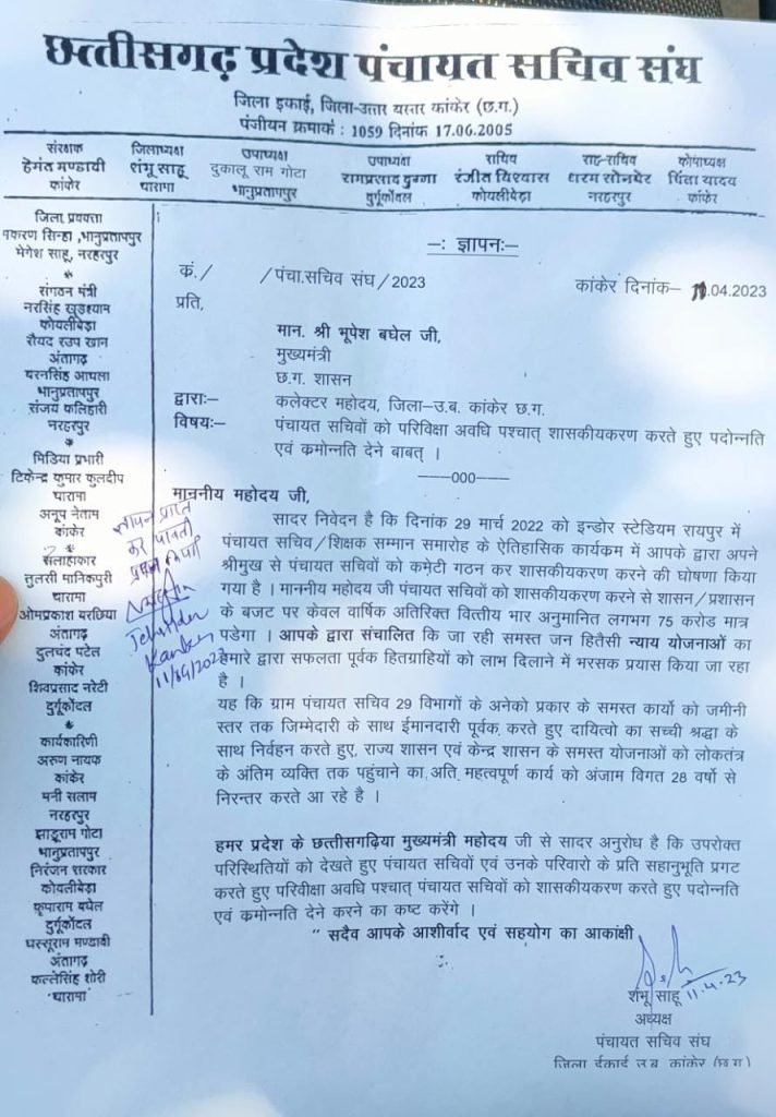 ज्ञातव्य हो कि छत्तीसगढ़ प्रदेश पंचायत सचिव संगठन छत्तीसगढ़ के आह्वान पर पंचायत सचिव अपनी एक सूत्रीय मांग परीवीक्षा अवधि पश्चात शासकीयकरण को लेकर 16 मार्च से छत्तीसगढ़ के सभी ब्लॉक मुख्यालय में काम बंद कलम बंद कर अनिश्चितकालीन हड़ताल में बैठ जाने से कामकाज पूरी तरह से ठप्प हो गई है ।