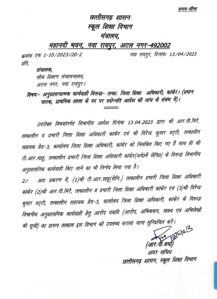 इसके पहले तत्कालीन प्रभारी डीईओ कांकेर आर पी मीरे, उनके कार्यालय के सहायक ग्रेड 3 वीरेन्द्र कुमार वट्टी को अवर सचिव स्कूल शिक्षा विभाग ने निलाबित कर दिया है ।