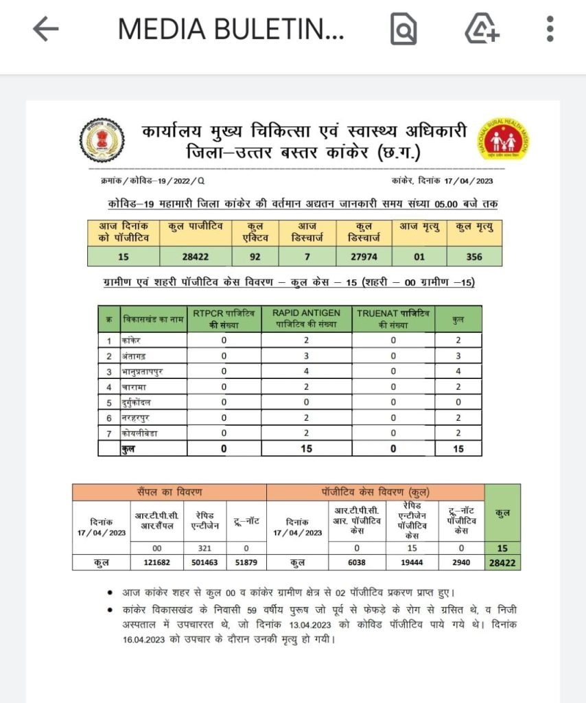 / जिले में इस दौर कोरोना में पहली मौत हुई है । पहले दौर से अब तक अब मृतकों की संख्या 356 हो गई है । 16अप्रैल 2023 को कांकेर विकासखंड निवासी एक 59 वर्षीय पुरुष की कांकेर की एक निजी अस्पताल में ईलाज चल रहा था, जो फेफड़े के रोग से ग्रशित थे जिन्हे 13अप्रैल को भर्ती कराया गया था । उनकी मृत्यु 16 अप्रैल को हो गई ।