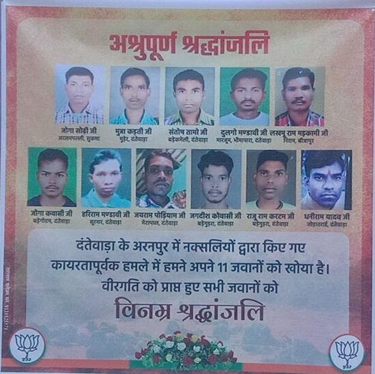 दंतेवाड़ा के अरनपुर में हुए IED ब्लास्ट में 10 जवान शहीद हुए हैं। इस नक्सली हमले में शहीद 10 DRG के जवानों में दंतेवाड़ा जिले से 8 जवान ने वीरगति को पायी है, जबकि एक जवान सुकमा और एक बीजापुर का सपूत है। दंतेवाड़ा के शहीद 8 जवानों में 2 जवान तो एक ही गांव के रहने वाले हैं। दोनों साथ-साथ भर्ती हुए और दोनों की शहादत भी एक ही दिन हो गयी। राजू राम करटम और जगदीश कोवासी दोनों कुआंकोंडा के बड़ेगुडरा के रहने वाले हैं। दोनों जवान 10 मार्च 2022 को भर्ती हुए थे। उसी तरह कटेकल्याण मारजूम भीमापारा के दुलगो मंडावी और कटेकल्याण के बड़े गादम के जोगा कवासी 6 मार्च 2023 को डीआरजी में भर्ती हुए थे। दोनों एक महीना 23 दिन ही नौकरी कर पाये उनकी शहादत हो गयी जिसको लेकर आज भारतीय जनता पार्टी के द्वारा नगर मे स्थित जय स्तम्भ मे कार्यकर्ताओ के द्वारा केंडिल जला ,मौन श्रद्धांजलि दी गई इस श्रद्धांजलि सभा मे भाजपा के जिलाध्यक्ष अनिल केशरवानी,लखन लाल श्रीवास्तव, वीरेंद्र सिंह् राणा, धर्मेंद्र पटवा, संजय गुप्ता,मनोज केशरवानी, हिमांशु श्रीवास्तव, चंदन सिंग, धीरज पासवान, प्रदीप वर्मा, अजय विश्वकर्मा, मंडल अध्यक्ष आलोक जायसवाल, विनोद गुप्ता,विवेक अग्रवाल, रामधुन जायसवाल, किशन साह जनकधारी, रितेश ताम्रकार, डाक्टर रश्मि सोनकर, कोमल पटेल,निधि मित्तल, सहित महिला मोर्चा की बहने उपस्थित थी।