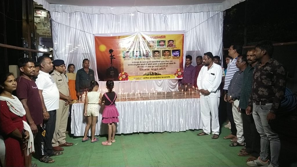 कोंडागांव – फरसगांव नगर के अमित इंट्रपाइजेस दुकान के समक्ष दंतेवाड़ा के अरणपुर क्षेत्र में नक्सली हमले में शहीद हुए जवानों को मोमबत्ती जलाकर श्रद्धांजलि अर्पित की गई है।