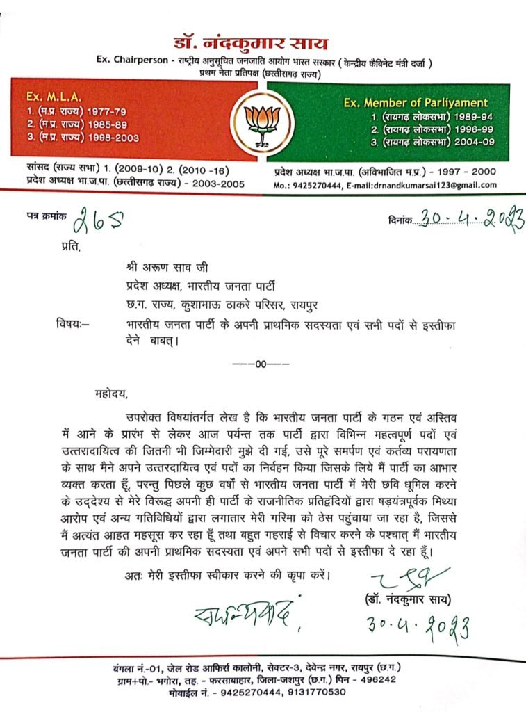 भाजपा के आदिवासी नेता नंदकुमार साय ने दिया इस्तीफे का प्रस्ताव…