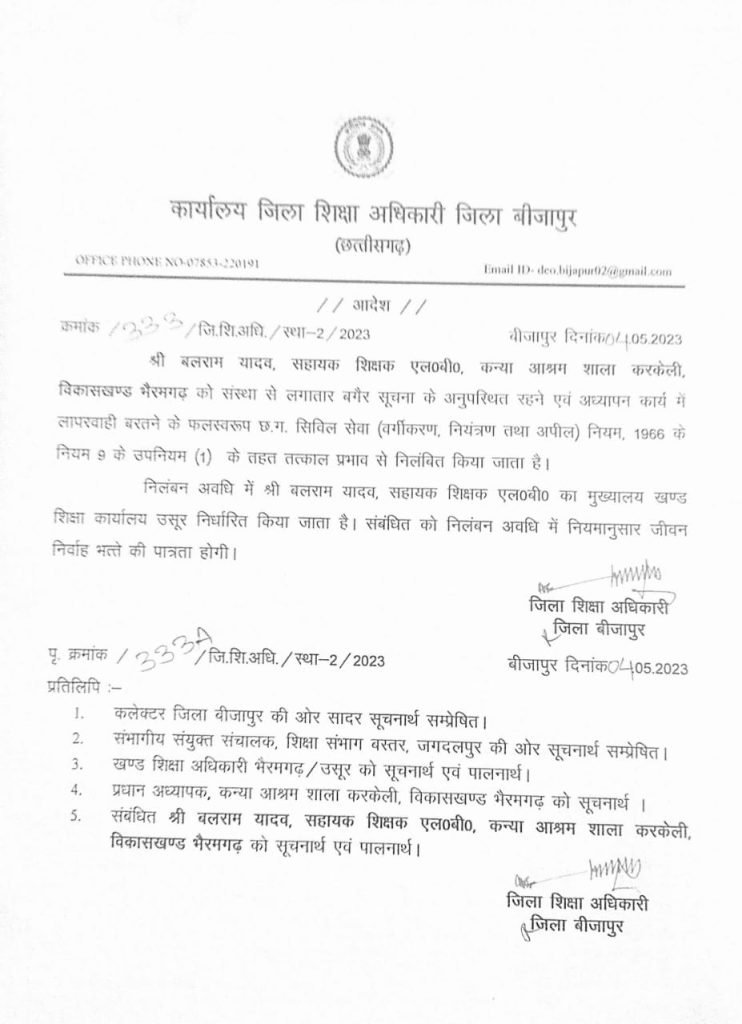 जिला शिक्षा अधिकारी बलिराम बघेल ने मामले में लापरवाही बरतने वाले एक सहायक शिक्षक(एल.बी.) को किया सस्पेंड. जिले के विकासखंड भैरमगढ़ के कन्या आश्रम शाला करकेली के बलराम यादव (सहायक शिक्षक) बैगर सूचना के संस्था से अनुपस्थित रहने एवं कार्य मे लापरवाही बरतने के शिकायत मिली थी। कार्य मे लापरवाही बरतने के फलस्वरूप छ.ग. सिविल सेवा(वर्गीकरण,नियंत्रण तथा अपील)नियम 1966 के नियम 9 के उपनियम(1) के तहत तत्काल प्रभाव किया गया निलंबित.