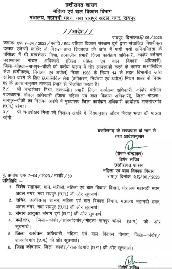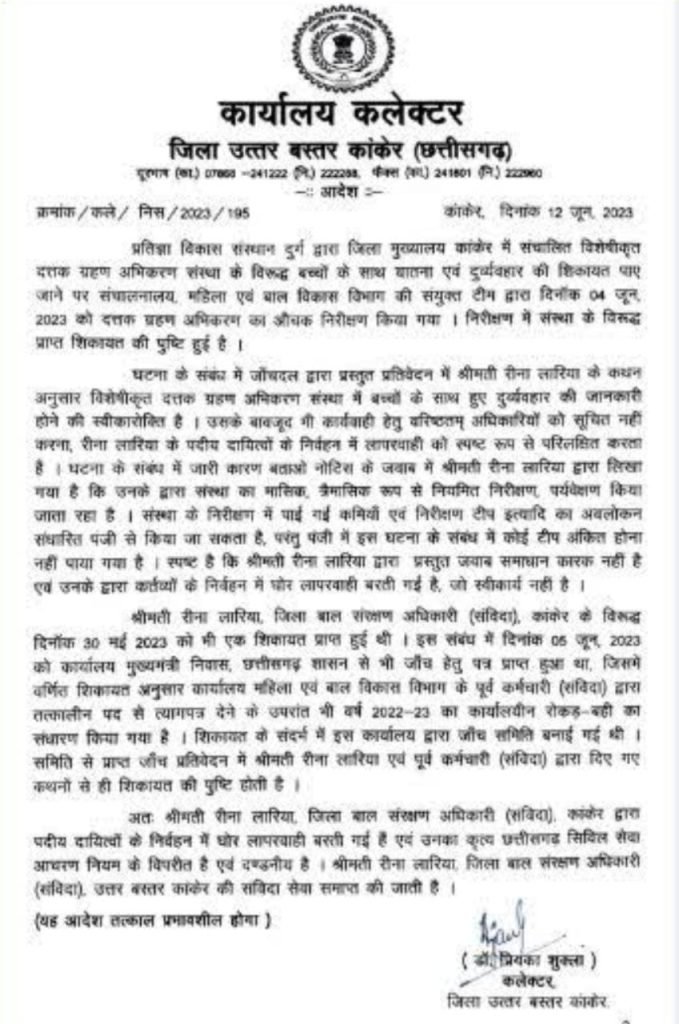 अपने आदेश में कलेक्टर ने उल्लेख किया है कि प्रतिज्ञा विकास संस्थान दुर्ग द्वारा जिला मुख्यालय कांकेर में संचालित विशेषीकृत दत्तक ग्रहण अभिकरण संस्था के विरुद्ध बच्चों के साथ यातना एवं दुर्व्यवहार की शिकायत पाए जाने पर संचालनालय , महिला एवं बाल विकास विभाग की संयुक्त टीम द्वारा दिनाँक 04 जून , 2023 को दत्तक ग्रहण अभिकरण का औचक निरीक्षण किया गया । निरीक्षण में संस्था के विरुद्ध प्राप्त शिकायत की पुष्टि हुई है । घटना के संबंध में जाँचदल द्वारा प्रस्तुत प्रतिवेदन में श्रीमती रीना लारिया के कथन अनुसार विशेषीकृत दत्तक ग्रहण अभिकरण संस्था में बच्चों के साथ हुए दुर्व्यवहार की जानकारी होने की स्वीकारोक्ति है । उसके बावजूद भी कार्यवाही हेतु वरिष्ठतम् अधिकारियों को सूचित नहीं करना , रीमा लारिया के पदीय दायित्वों के निर्वहन में लापरवाही को स्पष्ट रूप से परिलक्षित करता है । घटना के संबंध में जारी कारण बताओ नोटिस के जवाब में श्रीमती रीना लारिया द्वारा लिखा गया है कि उनके द्वारा संस्था का मासिक , त्रैमासिक रूप से नियमित निरीक्षण , पर्यवेक्षण किया जाता रहा है । संस्था के निरीक्षण में पाई गई कमियाँ एवं निरीक्षण टीप इत्यादि का अवलोकन संघारित पंजी से किया जा सकता है , परंतु पंजी में इस घटना के संबंध में कोई टीप अंकित होना नहीं पाया गया है । स्पष्ट है कि श्रीमती रीना लारिया द्वारा प्रस्तुत जवान समाधान कारक नहीं है एवं उनके द्वारा कर्तव्यों के निर्वहन में घोर लापरवाही बरती गई है , जो स्वीकार्य नहीं है । श्रीमती रीना लारिया , जिला बाल संरक्षण अधिकारी ( संविदा ) , कांकेर के विरुद्ध दिनाँक 30 मई 2023 को भी एक शिकायत प्राप्त हुई थी । इस संबंध में दिनांक 05 जून , 2023 को कार्यालय मुख्यमंत्री निवास , छत्तीसगढ़ शासन से भी जाँच हेतु पत्र प्राप्त हुआ था , जिसमें वर्णित शिकायत अनुसार कार्यालय महिला एवं बाल विकास विभाग के पूर्व कर्मचारी ( संविदा ) द्वारा तत्कालीन पद से त्यागपत्र देने के उपरांत भी वर्ष 2022-23 का कार्यालयीन रोकड़ नही का संधारण किया गया है । शिकायत के संदर्भ में इस कार्यालय द्वारा जाँच समिति बनाई गई थी । समिति से प्राप्त जाँच प्रतिवेदन में श्रीमती लारिया एवं पूर्व कर्मचारी ( संविदा ) द्वारा दिए गए कथनों से ही शिकायत की पुष्टि होती है । अतः श्रीमती रीना लारिया , जिला बाल संरक्षण अधिकारी ( संविदा ) , कांकेर द्वारा पदीय दायित्वों के निर्वहन में घोर लापरवाही बरती गई हैं एवं उनका कृत्य छत्तीसगढ़ सिविल सेवा आचरण नियम के विपरीत है एवं दण्डनीय है । श्रीमती रीना लारिया , जिला बाल संरक्षण अधिकारी ( संविदा ) . उत्तर बस्तर कांकेर की संविदा सेवा समाप्त की जाती है । यह आदेश तत्काल प्रभावशील होगा ।