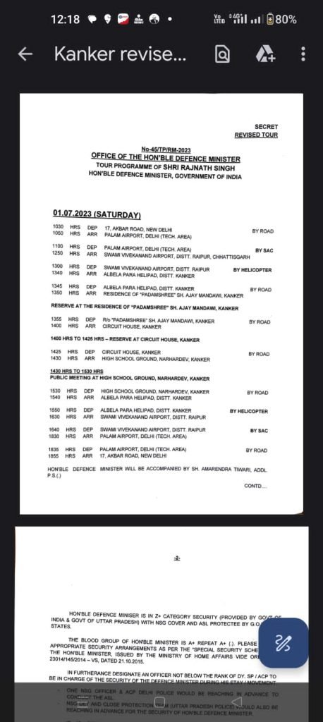 कांकेर/ आज 1 जुलाई को केंद्रीय रक्षा मंत्री राजनाथ सिंह अपने एक दिवसीय दौरे पर छत्तीसगढ़ आ रहे है , वे विशेष विमान SAC से 12.50 बजे स्वामी विवेकानंद एयरपोर्ट रायपुर पहुचेंगे,रायपुर से 1बजे वे हेलीकॉप्टर से कांकेर के लिए निकलेंगे, 1.45 बजे हेलीपेड अलबेला पारा कांकेर पहुचेंगे , 1.50 बजे वे कांकेर निवासी पदम श्री अजय मंडावी के निवास पहुंच कर उनसे मुलाकात करेंगे ।2बजे सर्किट हाउस कांकेर पहुचेंगे,2.25 बजे सर्किट हाउस कांकेर से नरहरदेव स्कूल ग्राउंड पहुंच कर विशाल जनसभा को 3.30 बजे तक संबोधित करेंगे,3.50 बजे वे हेलीकॉप्टर से रायपुर के लिए प्रस्थान करेंगे,4.30 बजे रायपुर एयरपोर्ट पहुचेंगे,फिर cac से दिल्ली के लिए प्रस्थान करेंगे,6.30 बजे दिल्ली एयरपोर्ट पहुचेंगे ।