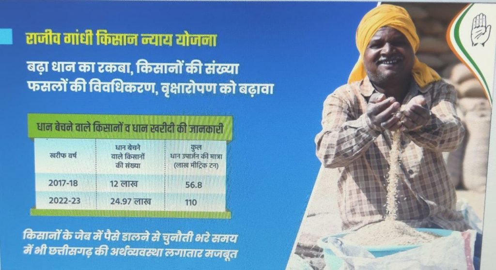जिला कांग्रेस कमेटी कोरिया के प्रवक्ता सौरव मिश्रा ने बयान जारी करते हुए कहा की प्रदेश की कांग्रेस सरकार देश की एक मात्र ऐसी सरकार है जो किसान को सशक्त बनाने का काम कर रही है। आज प्रदेश में राजीव गांधी किसान न्याय योजना लागू करके राज्य के किसानों के धान की खरीदी 2640 रु प्रति क्विंटल में की जा रही है जहां 2017- 18 में 12 लाख किसानों ने 56.8 लाख मीट्रिक टन धान बेचा, वही राजीव गांधी किसान न्याय योजना आने बाद 2022- 23 में 24.97 लाख़ किसानों ने लगभग 110 लाख मीट्रिक टन धान बेचा, जिससे उन किसानों के खाते में लगभग 19000 करोड़ रू का भुगतान किया जा चुका है आज प्रदेश में प्रति एकड़ 15 क्विंटल से बढ़ाकर 20 क्विंटल धान की खरीदी की जा रही है।