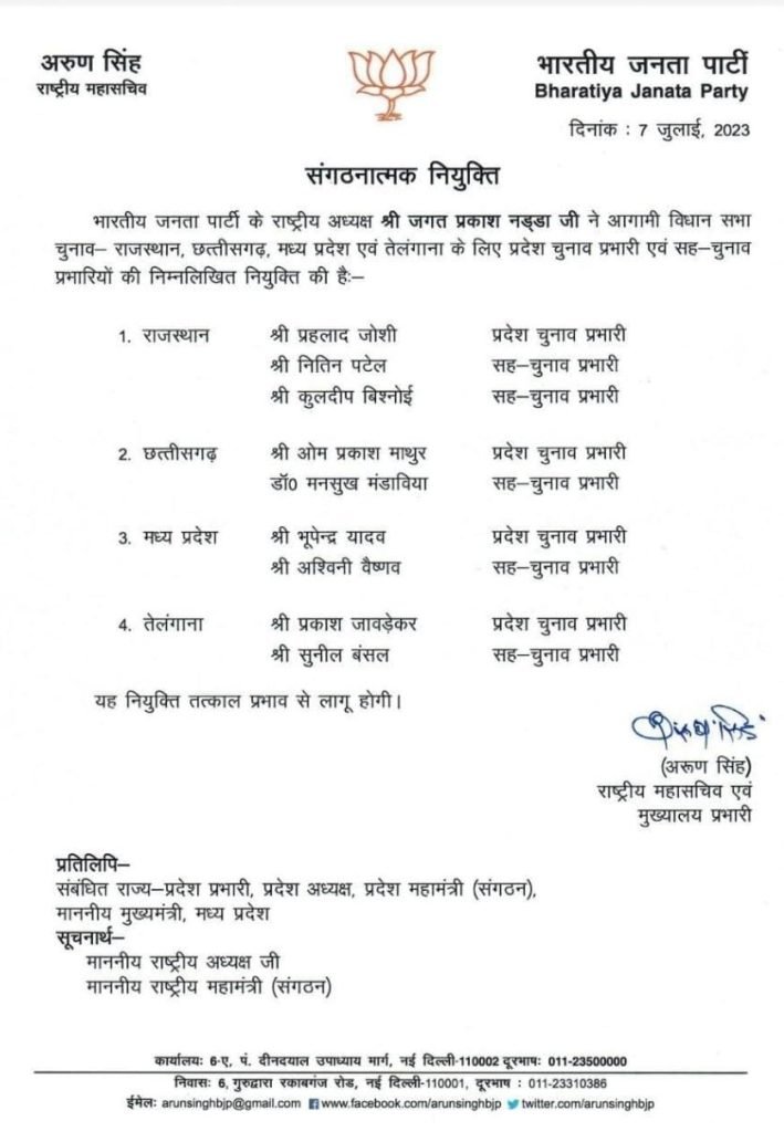 वही मध्यप्रदेश के लिए भाजपा ने भूपेंद्र यादव को प्रदेश चुनाव प्रभारी,अश्वनी वैष्णव को सह चुनाव प्रभारी का दायित्व दिया गया है ।