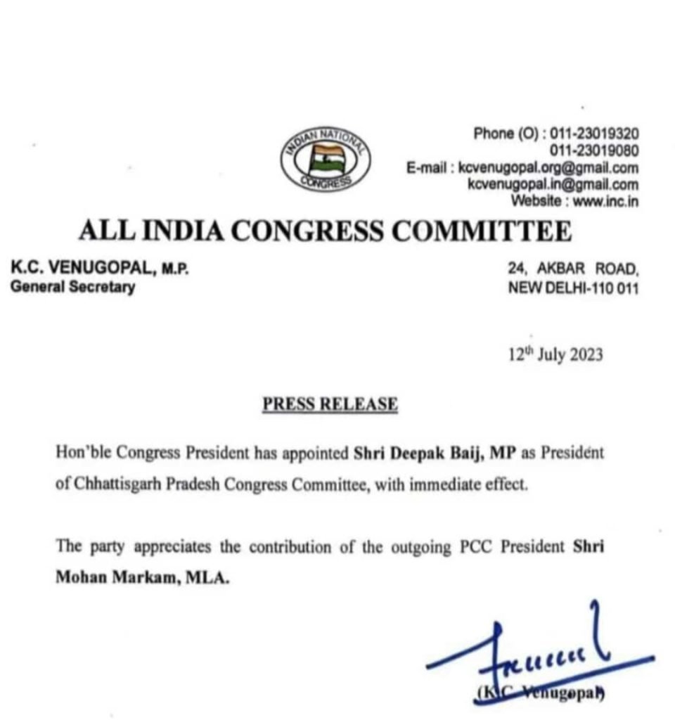 बस्तर सांसद दीपक बैज होंगे छत्तीसगढ़ प्रदेश कांग्रेस के नए अध्यक्ष।
