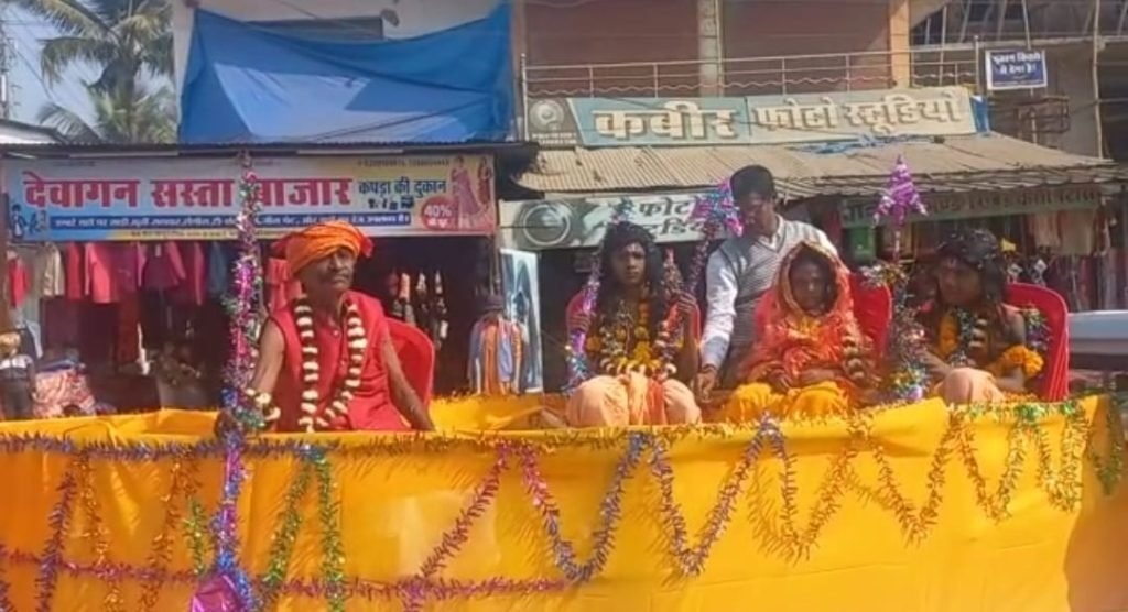 समाज के नन्हें मुन्हे बच्चों द्वारा भगवान श्री राम , माता सीता ,लक्ष्मण और भक्त गुहा निषाद राज के वेशभूशा में नजर आए । जिनके साथ समाज के लोगो द्वारा नगर के मुख्य मार्ग में शोभायात्रा व कलश यात्रा निकाली गई ।