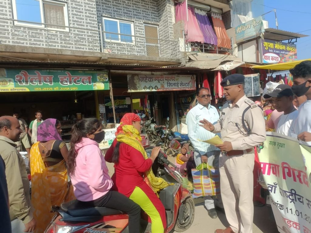 कोंडागांव – पुलिस अधीक्षक दिव्यांग पटेल के आदेश एवं अतिरिक्त पुलिस अधीक्षक शोभराज अग्रवाल के मार्गदर्शन व उप पुलिस अधीक्षक यातायात डाॅ. भुवनेश्वरी पैकरा के पयर्वेक्षण में राष्ट्रीय सड़क सुरक्षा सप्ताह के तहत साप्ताहिक बाजार कोण्डागांव में यातायात पुलिस एवं रानी दुगार्वती सेवा संस्था कोण्डागांव के द्वारा विभिन्न ग्रामों से आये ग्रामवासियों को यातायात नियमोें के बारे में जानकारी दिया गया तथा दो पहिये वाहन चलाते समय हेलमेट लगाने एवं चार पहिया वाहन चलाते समय सीट बेल्ट लगाने, शराब के नशे में वाहन न चलाने, वाहन संबंधित दस्तावेज, ड्रायविंग लायसेंस, आर सी, वाहन का बीमा, परमिट, पालुसन आदि सभी संबंधित दस्तावेज पूर्ण रखने के बारे में जानकारी दिया गया। वाहनो में क्षमता से अधिक सवारी न बैठाने के संबंध में भी जानकारी दिया गया।