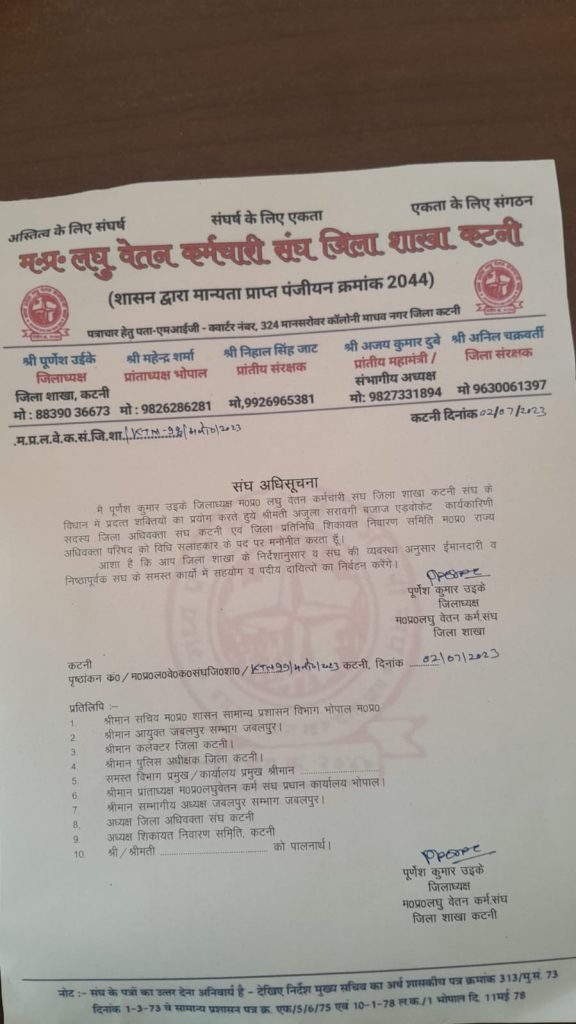 कटनी। मध्यप्रदेश लघु वेतन कर्मचारी संघ जिला शाखा कटनी (शासन से मान्यता प्राप्त)के जिला अध्यक्ष श्री पूर्णेश उइके ने श्री महेंद्र शर्मा प्रांताध्यक्ष भोपाल की सहमति से व श्री अनिल चक्रवर्ती जिला संरक्षक की अनुशंसा से कटनी जिले की अधिवक्ता श्रीमती अंजुला सरावगी बजाज (कार्यकारणी सदस्य जिला अधिवक्ता संघ कटनी व जिला प्रतिनिधि शिकायत निवारण समिति मध्यप्रदेश राज्य अधिवक्ता परिषद) को मध्यप्रदेश लघुवेतन कर्मचारी संघ जिला शाखा कटनी के विधि सलाहकार पद पर नियुक्त किया । इस नियुक्ति पर श्री पूर्णेश उइके ने अधिवक्ता श्रीमती अंजुला सरावगी बजाज से आशा व्यक्त की है कि आप संस्था के सभी निर्देशो का पालन करके संघ के प्रति निष्ठापूर्वक कार्य करेगी व संघ के नियमानुसार अपने दायित्व का पालन करते हुए संस्था के सभी सदस्यों को सहयोग प्रदान करेगी। एडवोकेट श्रीमती अंजुला सरावगी बजाज के विधि सलाहकार नियुक्त होने पर माननीय वरिष्ठ अधिवक्ता आर के सिंह सैनी (प्रदेश उपाध्यक्ष मध्यप्रदेश राज्य अधिवक्ता परिषद, जिला अध्यक्ष जबलपुर बार एसोसिएशन, व कटनी मंडला जिला प्रभारी),सुनील रांधेलिया, प्रियदर्शन गौर, प्रथम महापौर राजा भैया, एडवोकेट पी एल त्रिपाठी, एडवोकेट आर के बक्शी, एडवोकेट संजय उपाध्याय,एडवोकेट अंतु पांडेय, एडवोकेट प्रमोद मिश्र, एडवोकेट आर के बक्शी,एडवोकेट राजेश सिंह,एडवोकेट रंजना उपाध्याय, मनमोहन नायक, राजा सूर्यवंशी, एडवोकेट मनोज बाझल, मनोज निगम, राजू रजक, अंशुल बहरे, राजकुमार दासवानी, विष्णु बलेचा, राजेश खरे,संजीव श्रीवास्तव, नितिन रैकवार, हसन राशिद, वैध सुरेन्द्र विश्वकर्मा, मनमोहन शुक्ल, संजय गुप्त, शुभाष मालाकार आदि सदस्यों ने प्रांतीय पदअधिकारियों व जिला अध्यक्ष का आभार प्रदान करते हुए एडवोकेट अंजुला सरावगी बजाज द्वारा किये जाने वाले संस्था के समस्त कार्यो में अपना पूरा सहयोग प्रदान करने को कहा।