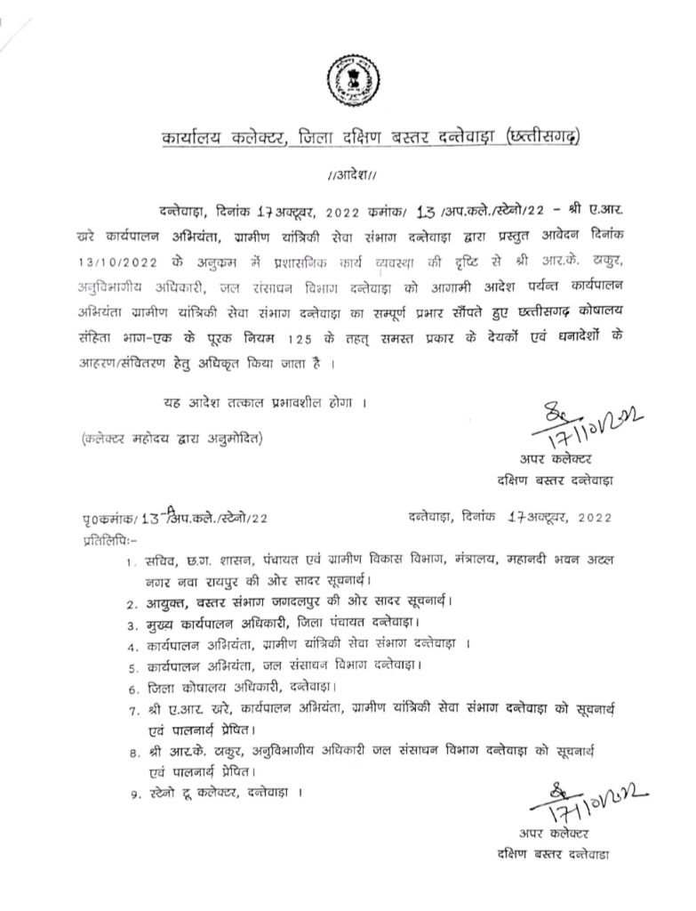 आर.के. ठाकुर को 17 अक्टूबर 2022 को प्रभार दिया गया था। जिसकी सूचना की प्रतिलिपि सभी को प्रेषित की गयी थी। इस अवकाश के दौरान 02 दिसम्बर 2022 को शासन के आदेश के तहत ए.आर.खरे को ईई आरईएस से सब इंजीनियर में पदावनत किया गया । पदावनति के पश्चात शासन से किसी अन्य ईई आरईएस की पदस्थापना नहीं की गई और न ही श्री खरे द्वारा उप अभियंता के रूप में अपनी उपस्थिति दी गई। इस संबंध में श्री खरे से कई बार दूरभाष के माध्यम से संपर्क करने की कोशिश भी की गई परन्तु उनके द्वारा किसी प्रकार का प्रतिक्रिया प्राप्त नहीं हुआ। श्री ए.आर.खरे उप अभियंता पद पर पदावनत होने के पश्चात तकनीकी रूप से ईई आरईएस के रूप में कार्य करने हेतु प्राधिकृत नहीं थे। आर.के.ठाकुर विभिन्न विभागीय( राज्य/ज़िला/संभाग स्तरीय )बैठकों में ईई आरईएस के रूप में शामिल होते रहें है और ज़िले में समस्त कार्यों को नियमानुसार प्रक्रिया का पालन करते हुए सम्पादित किया जा रहा है। इस प्रकार कतिपय समाचार पत्रों में छपा समाचार पूर्ण रूप से तथ्यहीन,प्रमाणहीन एवं भ्रामक होने के साथ-साथ शासन प्रशासन की छवि को धूमिल करने का प्रयास कहा जा सकता है और प्रशासन उपरोक्त समाचार पत्र में छपे समाचार का स्पष्ट रूप से खंडन करता है।