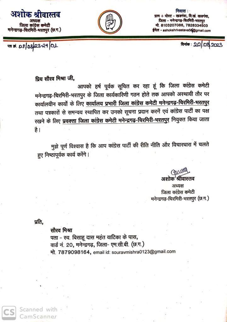 मनेंद्रगढ़। नवगठित जिला मनेंद्रगढ़ चिरमिरी भरतपुर में जिला कांग्रेस कमेटी के अध्यक्ष अशोक श्रीवास्तव की नियुक्ति हो गई है। काफी लंबे इंतजार के बाद कांग्रेस ने जिला अध्यक्ष के रूप में अशोक श्रीवास्तव पर जिम्मेदारी सौंपी है। जिला अध्यक्ष बनते ही अशोक श्रीवास्तव ने पहली नियुक्ति जारी की और नए जिले के जिला प्रवक्ता एवं कार्यालय प्रभारी के रूप में सौरव मिश्रा को नियुक्त किया है। स्थानीय जिला कांग्रेस कार्यकारिणी कमेटी गठित होने तक सौरव मिश्रा इस जिम्मेदारी का निर्वहन करते रहेंगे।