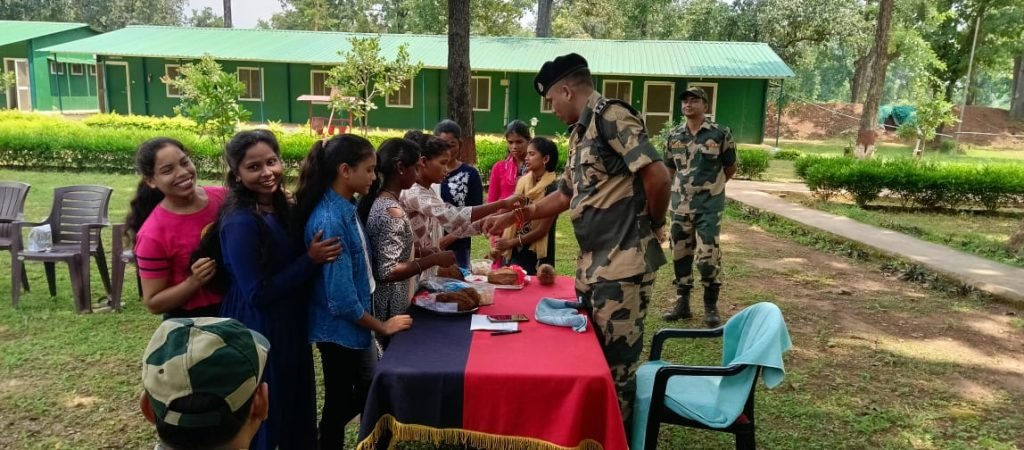 , कांकेर जिले के अंतिम छोर रावघाट से लगे बीएसएफ कैंप फूलपाड़ में पदस्थ जवान जो अपने परिवार ,घर से मिलो दूर रहकर देश के सेवा में अति संवेदनशील नक्सल प्रभावित क्षेत्र में रहकर बीएसएफ के जवान देश की रक्षा करते हैं इससे न सिर्फ ग्रामीणों में खुशी लौट रही है बल्कि लोगों की सामाजिक सेवा में भी तत्पर रहने वाले जवानों को रक्षाबंधन के इस पवित्र त्यौहार पर बहनों ने बीएसएफ के जवानों को रक्षा सूत्र बांधकर रक्षाबंधन की त्यौहार मनाया, ग्राम फूलपार में बीएसएफ कैंप में बहनों ने फुलपार में आस पास के 6 से 7 गांव की युवतियां और महिलाओं ने बीएसएफ कैंप जाकर सभी जवानों को राखी बांधकर मिठाई खिलाई, इस भाई बहन के प्रेम का पर्व राखी के दिन घर से दूर बीएसएफ के जवान इन लड़कियों और महिलाओ का प्यार पाकर बहुत खुश हुए। बीएसएफ कैंप फुलपार के कम्पनी कमांडर ने सभी को मिठाई खिलाकर और उपहार देकर तहे दिल से बहनों शुक्रिया अदा किया और आगे भी सभी पर्वों में इसी तरह आते रहने के लिए आग्रह किया ।