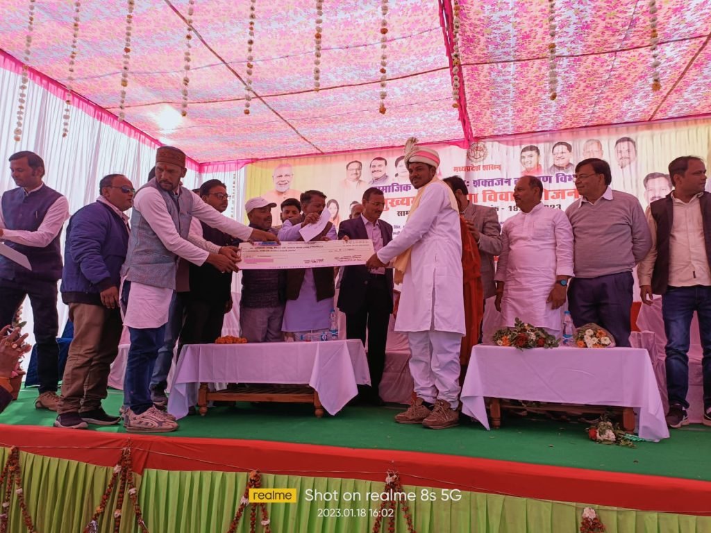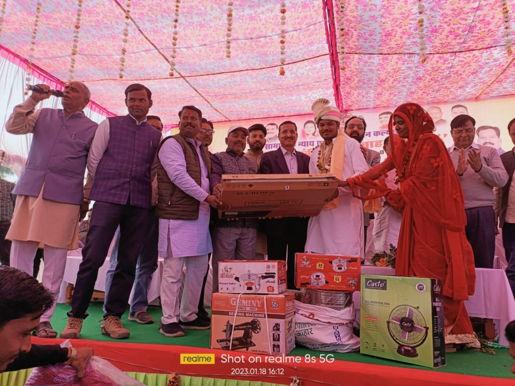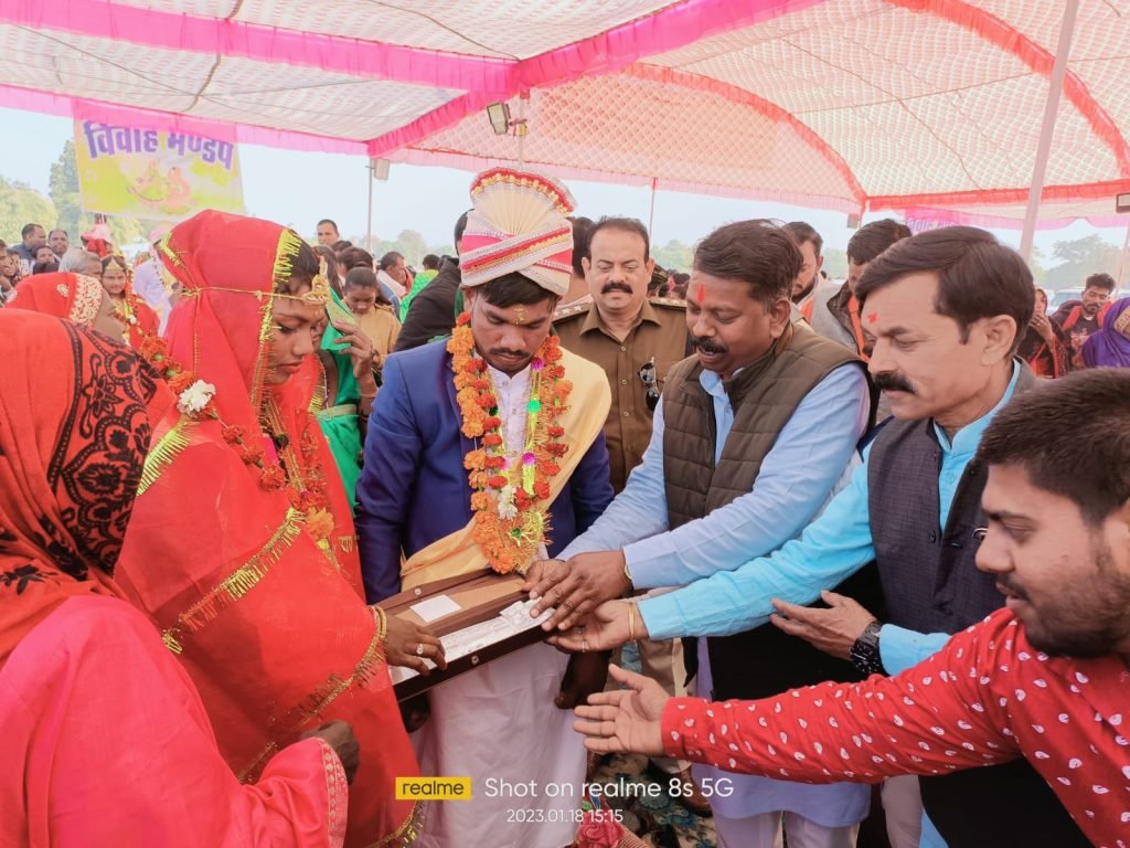 मुख्यमंत्री कन्या विवाह योजना के तहत 41जोड़ो का विवाह हुआ सपन्न. नौरोज़ाबाद // उमरिया जिले के जनपद पंचायत करकेली अंतर्गत हायर सेकेंडरी विद्यालय प्रांगण मे 41 वर बधुओ के जोड़ो का विवाह सपन्न हुआ.मुख्य मंत्री कन्या विवाह योजना कार्यक्रम की शुरुआत जनपद पंचायत करकेली प्रांगण से बारात गाजे बाजे के साथ निकालकर की गई. बारात मे बांधवगढ़ विधायक शिवनारायण सिंह तथा पूर्व मंत्री तथा पूर्व सांसद ज्ञान से हुए शामिल. बारात की आगवानी हायर सेकेण्डरी स्कूल प्रांगण मे कलेक्टर और उमरिया जिला प्रशासन के द्वारा की गई. बारात आगवानी के पश्चात विवाह मंडफ मे उपस्थित आचार्यों के द्वारा 41 वर बधुओ के जोड़ो का विवाह वैदिक मंत्र उपचार एवं विधि विधान से कराया गया. तथा वर बधुओ के विवाह के पश्चात मंचासीन मुख्य अतिथियों के द्वारा उपहार भी प्रदान किया गया. मंचीय कार्यक्रम मे मुख्य मंत्री कन्या विवाह योजना के मुख्य अतिथि बांधवगढ़ विधायक शिवनारायण से के द्वारा अपने उद्बोधन में मे कहा गया की ज़ब से मध्यप्रदेश मे भारतीय जनता पार्टी की सरकार बनी है तब से गरीबो के हित मे काम कर रही है जिसका एक उदाहरण मुख्य मंत्री कन्या विवाह योजना है जिसके तहत गरीब कन्याओं का विवाह कराया जाता है.आज मुख्य मंत्री कन्या सामूहिक विवाह योजना के तहत 41 जोड़ो का विवाह का हायर सेकेण्डरी स्कूल प्रांगण साक्षी बना. उक्त कार्यक्रम मे पूर्व सांसद पूर्व मंत्री ज्ञान सिंह. बांधवगढ़ विधायक शिवनारायण सिंह. जिला पंचायत सदस्य ओमकार सिंह. बेला अर्जुन सिंह. मीना कैलाश सिंह. भा ज पा पूर्व जिला अध्यक्ष राकेश शर्मा. जनपद अध्यक्ष करकेली प्रियंका सिंह. उपाध्यक्ष पूनम साहू. संग्राम सिंह . योगेश द्विवेदी. राजेश पवार. उमरिया कलेक्टर के डी तिरपाठी. एस डी एम सिद्धार्थ पटेल जनपद सी ओ के के रैकवार सहित जनप्रतिनिधियों के साथ पूरा प्रशासनिक अमला मौजूद था .