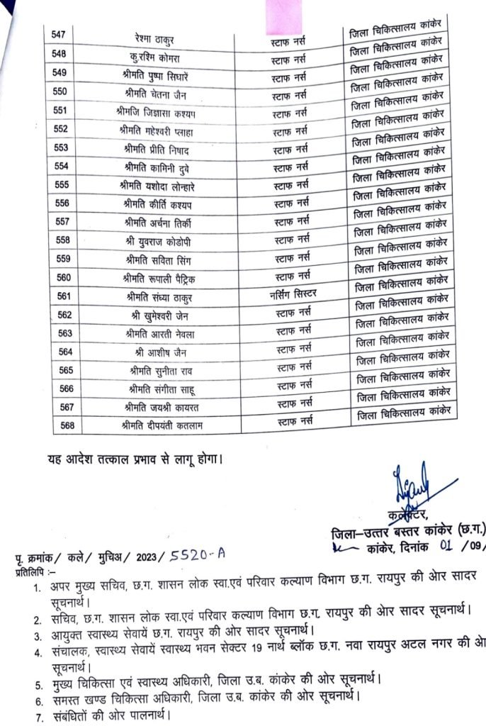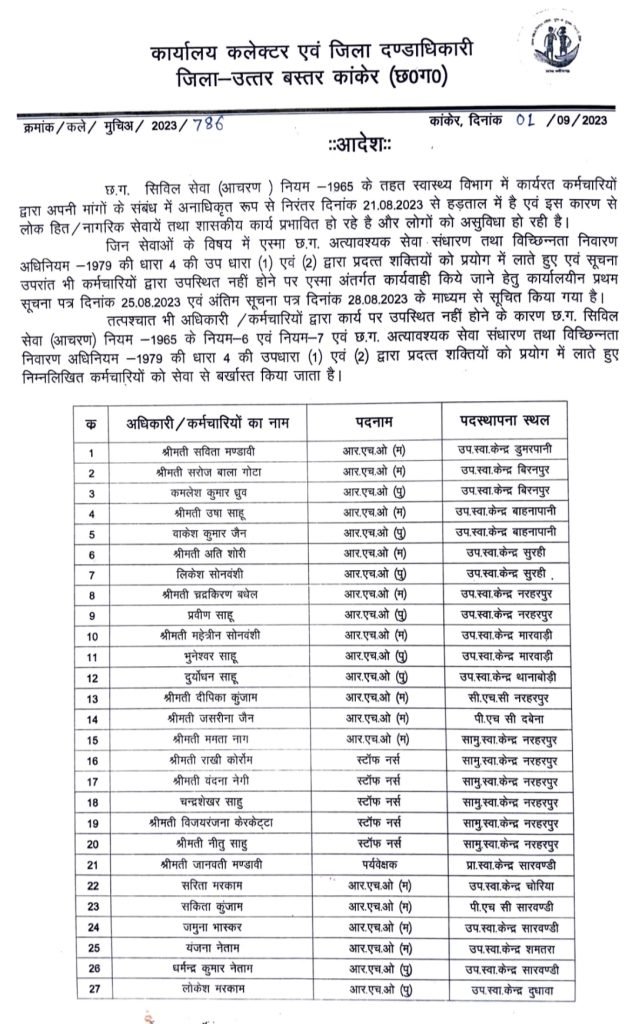 जिले के स्वास्थ्य विभाग में कार्यरत कर्मचारियों द्वारा अपनी मांगों के संबंध में अनाधिकृत रूप से निरंतर दिनांक 21.08.2023 से हड़ताल में है जिसके कारण से लोक हित / नागरिक सेवायें तथा शासकीय कार्य प्रभावित हो रही है व लोगों को असुविधा हो रही है। जिन सेवाओं के विषय में एस्मा छ.ग. अत्यावश्यक सेवा संधारण तथा विच्छिन्नता निवारण अधिनियम 1979 की धारा 4 की उप धारा (1) एवं ( 2 ) द्वारा प्रदत्त शक्तियों को प्रयोग में लाते हुए एवं सूचना उपरांत भी कर्मचारियों द्वारा अपने कार्यों में उपस्थित नहीं होने पर एस्मा अंतर्गत कार्यवाही किये जाने हेतु कार्यालयीन प्रथम सूचना पत्र दिनांक 25.08.2023 एवं अंतिम सूचना पत्र दिनांक 28.08.2023 के माध्यम से सूचित किया गया है। तत्पश्चात भी अधिकारी / कर्मचारियों द्वारा कार्य पर उपस्थित नहीं होने के कारण छ.ग. सिविल सेवा (आचरण) नियम 1965 के नियम-6 एवं नियम – 7 एवं छ.ग. अत्यावश्यक सेवा संधारण तथा विच्छिन्नता निवारण अधिनियम 1979 की धारा 4 की उपधारा (1) एवं ( 2 ) द्वारा प्रदत्त शक्तियों को प्रयोग में लाते हुए निम्नलिखित कर्मचारियों को सेवा से बर्खास्त किया जाता है जिसके आदेश जारी किए गए ।