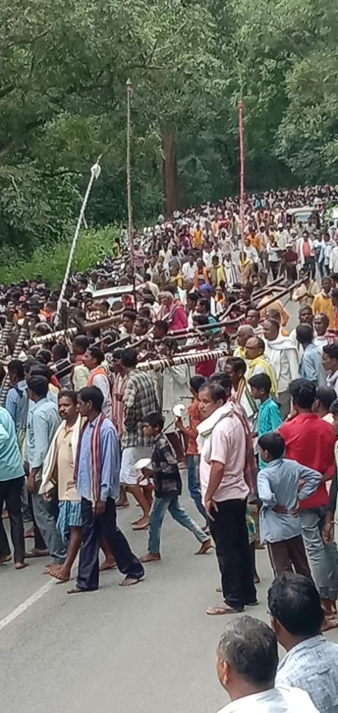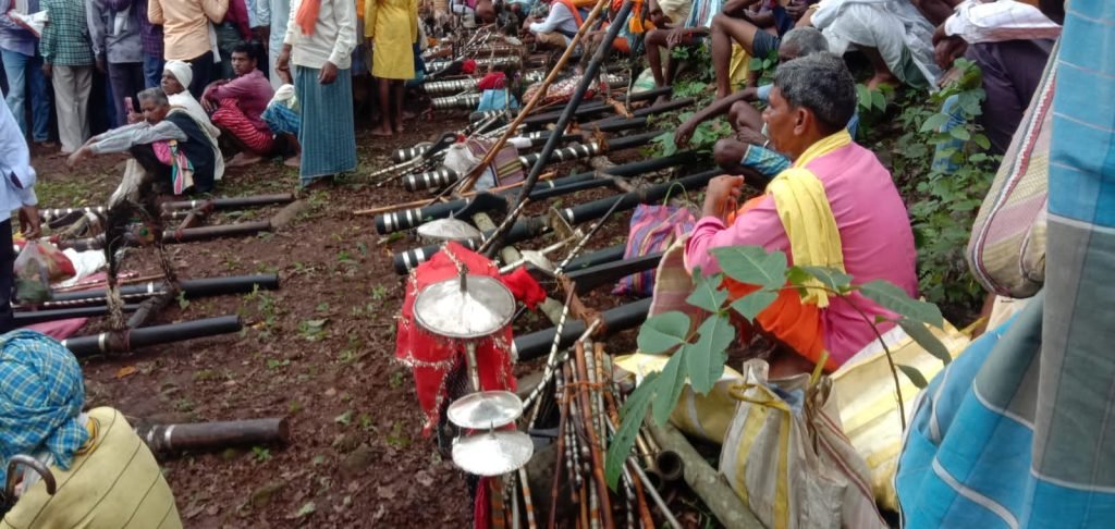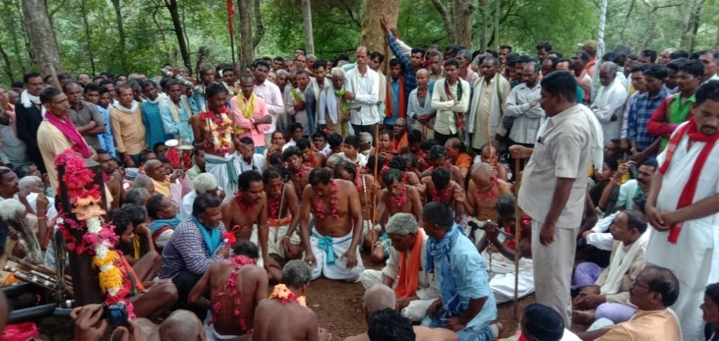शनिवार को सुबह 10 बजे आठदाहरा के पास 500 से अधिक गांव के आदिवासी जुटे। अधिकांश लोगों के कांधे पर आंगा देव, हाथ में छड़ी व पूजा का अन्य सामान था। भास्कर की टीम इन आदिवासियों के साथ करीब 200 मीटर पैदल चलकर सुबह 11.30 बजे कारीपानी के पास सड़क किनारे पहुंचे, जहां पहल से आदिवासियों की खूब भीड़ थी। मुख्य पुजारी प्रफुल्ल ठाकुर द्वारा भंगाराव माई यानी न्यायाधीश के दरबार में पूजा-पाठ कर रहे थे।