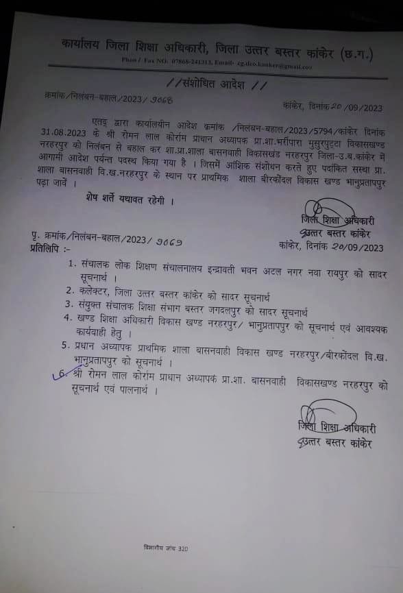 बच्चों ने इसकी जानकारी पालक समिति को प्रदान किया तत्पश्चात गांव में यह बात गांव में आज की तरह फैल गई पालक समिति के अध्यक्ष एवं ग्रामीण मुखिया जनो को स्कूल के समिप निवास करने वाले संदीप द्विवेदी को अवगत करवाया जो तत्काल पहुंचकर शिक्षक का ज्यादा लेना चाहे पर शिक्षक स्कूल से जा चुका था बच्चों ने अपनी समस्या बताई जिसका वीडियो ग्राफी भी संदीप द्विवेदी ने किया यह बात जिला शिक्षा अधिकारी और खंड शिक्षा अधिकारी को दिया गया व्हाट्सएप के माध्यम से वीडियो भी भेजा गया परंतु कोई खोज खबर उसे दिन नहीं हुआ शिक्षा विभाग द्वारा मामला पंचायती स्तर पर पहुंचने में जिला शिक्षा अधिकारी एवं खंड शिक्षा अधिकारी से फोन पर संपर्क किया गया तब BRC द्वारा निरीक्षण करवाया गया जिसमें मामला सत्य पाया गया फिर भी जिला शिक्षा अधिकारी ने किसी भी प्रकार की पहल नहीं की इसके उलट शिक्षक की पत्नी ने गांव के समाजसेवी संदीप द्विवेदी के खिलाफ मानसिक प्रताड़ना कर रहे हैं कहकर S P कांकेर को ग्यापन दे दिया जिसे जांच प्रारंभ हो गया जिस गांव वाले आक्रोश में आ गए एवं दल बल के साथ कलेक्टर के पास एवं पुलिस अधीक्षक के पास पहुंचे कलेक्टर के निर्देश से तत्काल ही शिक्षक को उस स्कूल से हटा दिया गया कलेक्ट्रेट पहुंचे स्कूली बच्चो के साथ संदीप द्विवेदी छबिलाल गणेश दिनेश यादव शिवकुमार यादव अन्य ग्रामीण मौजूद थे