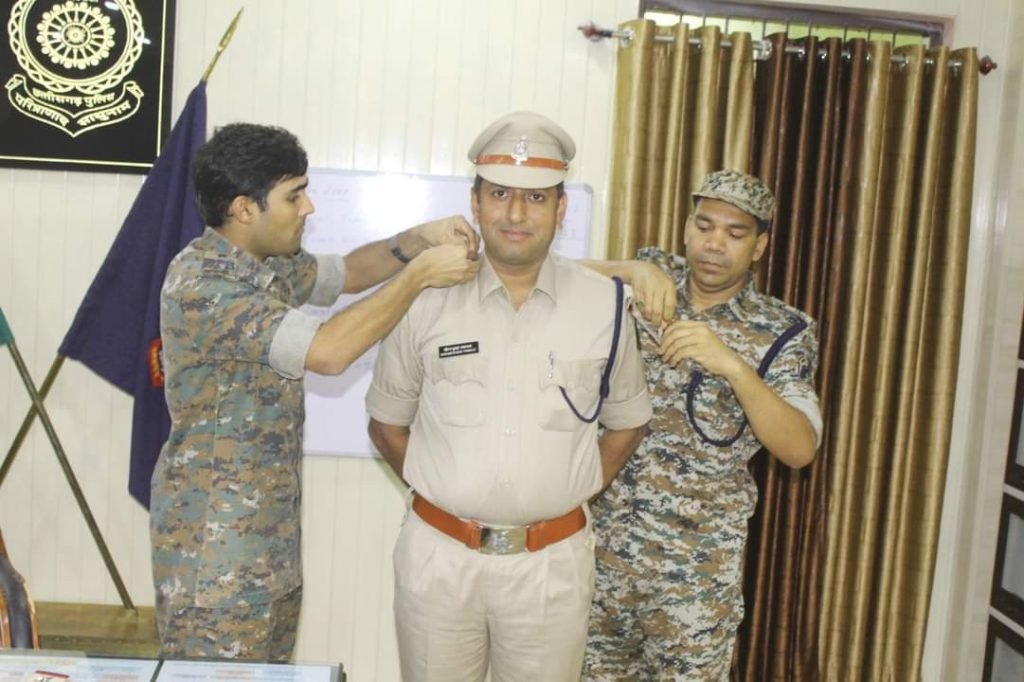 उपनिरीक्षक पद से निरीक्षक पर में पदोन्नत होने पर 21 सितम्बर गुरुवार को कोण्डागाँव के पुलिस अधीक्षक वाय अक्षय कुमार के द्वारा पुलिस अधीक्षक कार्यालय में पदोन्नत हुए शौरव उपाध्याय के कंधे में स्टार लगाकर, मिठाई खिलाकर निरीक्षक बनने की शुभकामनाएं दिये और कहा कि प्रमोशन मिलने के साथ साथ जिम्मेदारियां और विभाग के प्रति जवाबदेही अधिक बढ़ जाती है, ऐसे में अपने अनुभव का लाभ उठाते हुए पूरी निष्ठा ईमानदारी मेहमत और लगन के साथ काम करे । जनता के प्रति मधुर व्यवहार रखे । थाने में आये हर फरियादियों की समस्याओं को गंभीरतापूर्वक सुने उसके बाद उसका गुणवत्ता पूर्वक त्वरित निस्तारण करे । क्षेत्र में हो रही हर गतिविधि पर अपनी पैनी नजर रखे। इस दौरान कोंडागाँव उप पुलिस अधीक्षक दौलत राम पोर्ते भी उपस्तिथ रहे ।