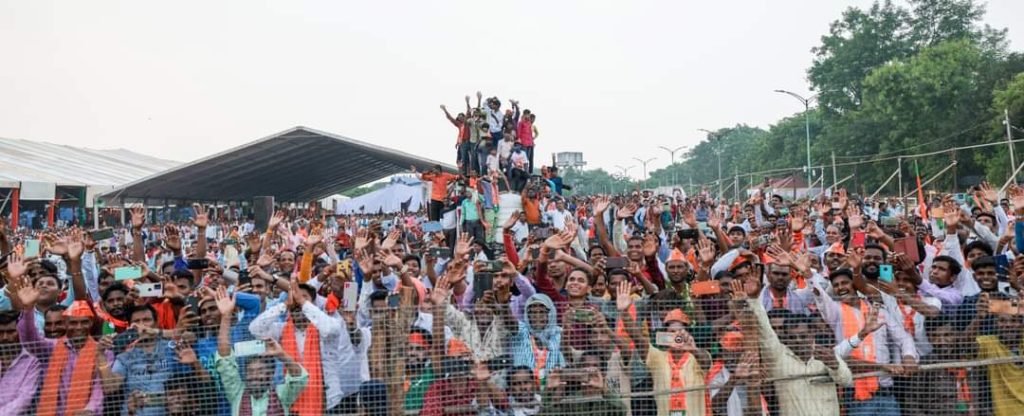 *जनता की भारी भीड़ ने मोदी-मोदी के नारे लगाए प्रधानमंत्री नरेन्द्र मोदी ने हाथ हिलाकर उनका अभिवादन किया।*