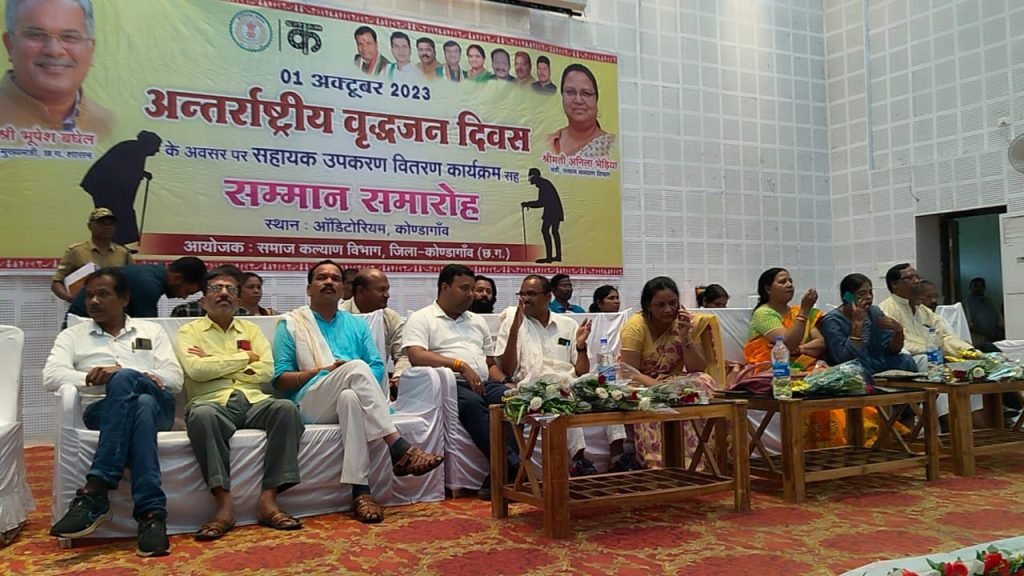 कोंडागांव जिला मुख्यालय अंतर्गत नगर पालिका ऑडिटोरियम हॉल में 1 अक्टूबर को अंतर्राष्ट्रीय वृद्धजन दिवस का आयोजन समाज कल्याण विभाग के तत्वाधान में आयोजित की गई। जिसमे नगर के तथा ग्रामीण इलाको के सैकड़ो वृद्धजन शामिल हुए। वहीं इस अवसर पर वरिष्ठ जानो का श्रीफल व साल भेंट कर सम्मान भी किया गया। आपको बता दे कार्यक्रम में मुख्य अतिथि के रूप में जिला पंचायत उपाध्यक्ष भगवती पटेल, नगर पालिका अध्यक्षा श्रीमती वर्षा यादव, कांग्रेस कमेटी के जिला अध्यक्ष झुम्कुक लाल दीवान, कोंडागांव जनपद पंचायत अध्यक्ष शिवलाल मांडवी, जिला पंचायत सीईओ प्रेम प्रकाश शर्मा सहित अन्य जनप्रतिनिधि एवं अधिकारी कर्मचारी उपस्थित रहे। इस कार्यक्रम के माध्यम से जिले के निशक्तजनों को सहायक उपकरण का वितरण किया गया। वहीं उनका स्वास्थय परीक्षण करते हुए उन्हें जरूरी दवाइयां भी उपलब्ध कराई गई।