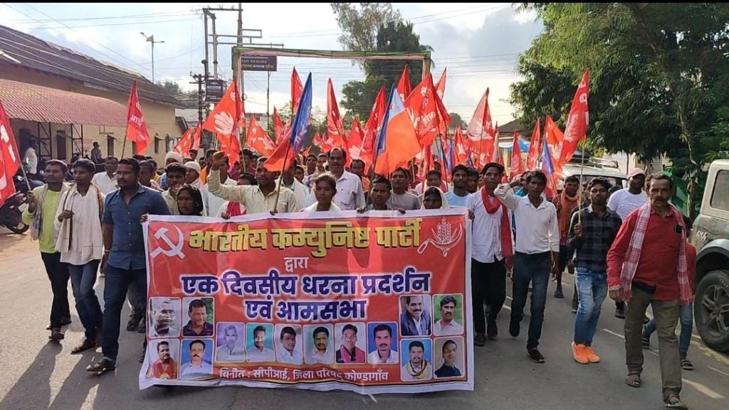 कोंडागांव जिला सहित बस्तर संभाग की समस्याओं पर तत्काल कार्यवाही कर समस्याओं के निदान हेतु भारतीय कम्युनिस्ट पार्टी जिला परिषद कोंडागांव के द्वारा 3 अक्टूबर को नगर में सरकार एवम प्रशासन के खिलाफ विरोध प्रदर्शन करते हुए रैली निकाली गई। वहीं राज्यपाल एवं मुख्यमंत्री के नाम ज्ञापन सौंपा गया। आपको बता दे विगत दिनों सीपीआई कोंडागांव के संभावित प्रत्याशी के ऊपर कथित तौर पर राजनीतिक दलों के द्वारा प्रायोजित जानलेवा हमला किया गया जिसको लेकर सीपीआई ने कड़े शब्दों में निंदा की है। वहीं प्रधानमंत्री नरेंद्र मोदी के बस्तर दौरे के दौरान कांग्रेस के बस्तर बंद के आह्वान को लोकतंत्र की हत्या बताया। साथ ही नगरनार स्टील प्लांट के निजीकरण का विरोध किया।