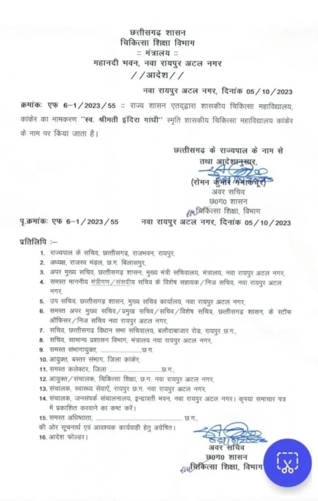 कांकेर मेडिकल कालेज का नाम स्वर्गीय इंदिरा गांधी स्मृति शासकीय चिकित्सा महाविद्यालय होगा।