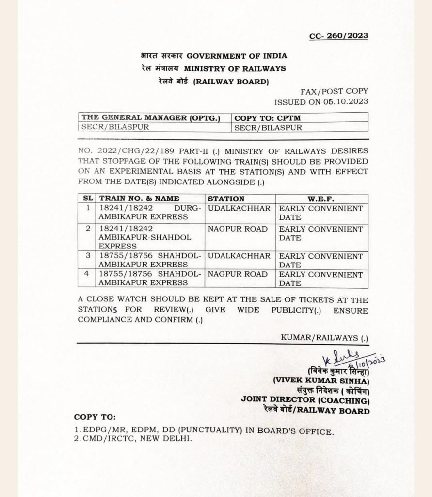 पूर्व मे संचालित ट्रेनों को वैश्विक कोरोना महामारी के कारण उक्त ट्रेनों के ठहराव को निरस्त कर दिया गया था जिसे रेल मंत्रालय द्वारा अंबिकापुर दुर्ग एवं अंबिकापुर शहडोल एक्सप्रेस ट्रेन का ठहराव नागपुर रोड हाल्ट एवं उदलकछार स्टेशन में जनमानस की महत्वपूर्ण मांग के आधार पर 18241/ 18242अंबिकापुर-दुर्ग- अंबिकापुर एक्सप्रेस एवं 18755/ 18756 अंबिकापुर- शहडोल- अंबिकापुर एक्सप्रेस ट्रेनों का स्टॉपेज नागपुर और उदलकछार में रेलवे द्वारा पुनः प्रारंभ किये जाने पर माननीय केंद्रीय राज्य मंत्री श्रीमती रेणुका सिंह जी के सफल प्रयास से संभव हो पाया है । जिसके लिए पार्टी के समस्त कार्यकर्ताओ के द्वारा सुबह 10 बजे नागपुर स्टेशन व सुबह 10 बजे उदलकछार रेलवे स्टेशन मे देश के यशश्वी प्रधानमंत्री माननीय नरेन्द्र मोदी जी एवं रेल मंत्री अश्वनी वैष्णव जी को बधाई दी जाएगी तथा ट्रेन का स्वागत पटाखे फोड़ , फुल मलाओ के साथ आम जन एवं कार्यकर्ताओ के द्वारा किया जाना है।