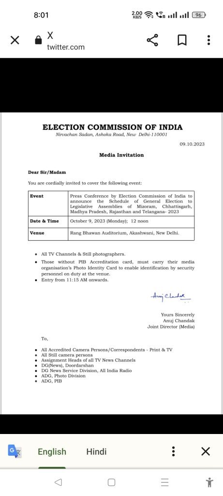- रायपुर/दिल्ली ,भारत निर्वाचन आयोग द्वारा 5 राज्यों ,मिजोरम , छत्तीसगढ़ ,मध्यप्रदेश,राजस्थान, तेलंगाना,के विधानसभा के लिए जनरल इलेक्शन की तारीखों का एलान आज कर सकती है जिसके लिएआज 9 अक्टूबर2023 के दोपहर 12 बजे दिल्ली के रंग भवन आडीटोरियम आकाशवाणी दिल्ली में प्रेस कॉन्फ्रेंसआयोजित की है । तारीखों के एलान के बाद माना जा रहा है कि आज उक्त 5 राज्यों में आदर्श चुनाव आचार संहिता प्रभावी हो जायेगी ।