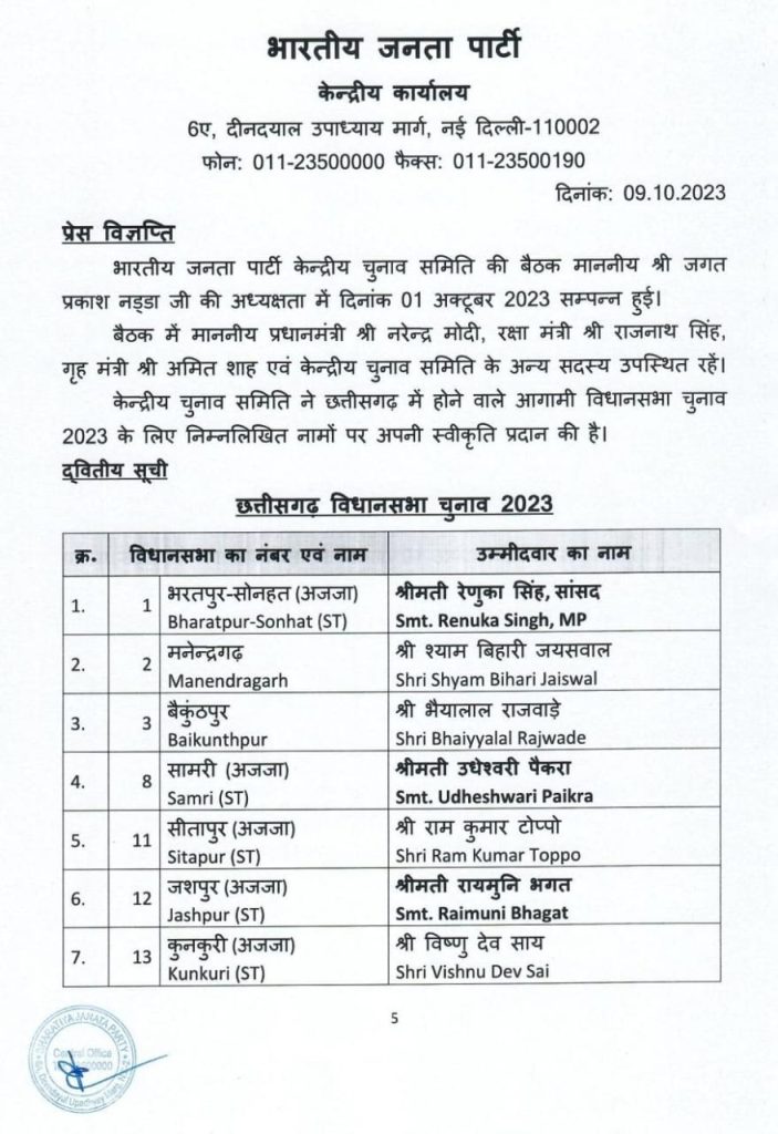 बीजेपी प्रत्याशियों की दूसरी सूची जारी ,रायगढ़ से ओपी चौधरी, जबकि केशकाल से नीलकंठ टेकाम ,सांसद अरूण साव लोरमी से चुनाव लड़ेंगे,पूर्वमुख्यमंत्री रमन सिंह लड़ेंगे राजनांदगांव से, जगदलपुर से किरण देव मैदान में….