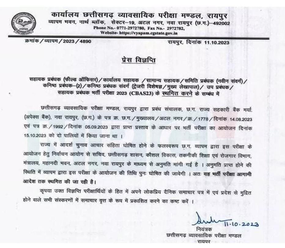 रायपुर /व्यापम द्वारा 15 अक्टूबर दिन रविवार को आयोजित होने वाली परीक्षा को निर्वाचन आयोग की अनुमति की प्रत्याशा में स्थगित कर दिया गया है । प्रथम पाली में प्रातः 10 से 12.15 बजे तक सहायक प्रबंधक (फील्ड ऑफिसर) कार्यालय सहायक, सामान्य सहायक, समिति प्रबंधक (नवीन सवंर्ग) एवं द्वितीय पाली में दोपहर 2 से सायं 4.15 बजे तक कनिष्ठ प्रबंधक संवर्ग (ट्रेजरी विशेषज्ञ, मुख्य लेखापाल), उप प्रबंधक और सहायक प्रबंधकजैसे पदों पर होनी थी भर्ती परीक्षा । अनुमति प्राप्त होने पर व्यापम द्वारा पृथक से परीक्षा तिथि घोषित की जाएगी ।