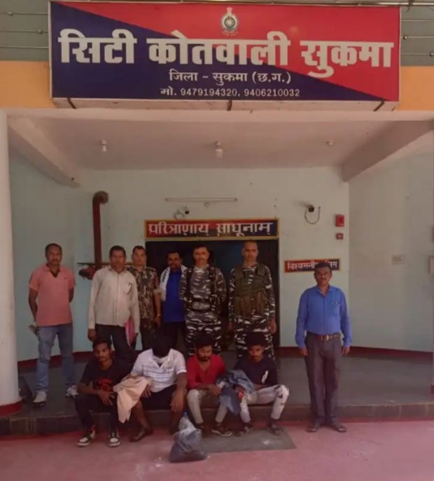 जिला सुकमा में पुलिस अधीक्षक महोदय किरण चव्हाण, कमाण्डेन्ट 02 री वाहिनी श्री रतिकांत बेहरा के मार्ग-दर्शन एवं अतिक्ति पुलिस अधीक्षक श्री प्रभात कुमार, अतिरिक्त पुलिस अधीक्षक श्री आकश मरकाम, आकाश मंडल अतिक्ति पुलिस अधीक्षक के निर्देशन तथा पुलिस अनुविभागीय अधिकारी सुकमा श्री परमेश्वर तिलकवार के पर्यवेक्षण में मादक पदार्थाें की तस्करी के रोकथाम हेतु चलाये जा रहे अभियान के तहत मुखबिर की सूचना पर थाना सुकमा से निरीक्षक शशीकांत भारद्वाज थाना प्रभारी सुकमा के हमराह जिलाबल एवं सीआरपीएफ के निरीक्षक तेजाराम, उनि. राजबीर सिंह द्वारा मलकानगिरी (ओडिशा) से सुकमा की ओर आने वाले मार्ग में फुडपार्क सुकमा के पास आने-जाने वाले वाहनों की चेकिंग की जा रही थी, इस दौरान मलकानगिरी की ओर से 01 काले रंग की इंडीका सी.एस. कार वाहन क्रमांक सी.जी. 18 सी. 0625 मे सवार होकर चार व्यक्ति मलकानगिरी से सुकमा की ओर आ रहे थे, जिन्हे रोक कर वाहन की तलाशी लेने पर काले रंग की प्लास्टिक थैले के अंदर NRx Dicyclomine Hcl, Tramadol Hcl – Acetaminophen Capsules, Pyeevon Spas Plus capsul, Aiprazolam tablets I.P.k~ 0.5mg Becalm 0.5, कैप्सूल में Tramadol Hydrochloride होना पाया गया जो कि प्रतिबंधित है बरामद समस्त प्रतिबंधित दवाईयों की अनुमानित कीमत लगभग 26353.00/- रूपये का परिवहन करते हुये पाया गया। उक्त कृत्य विधि विरूद्ध पाये जाने से चारों आरोपियों 01. सौरभ अग्र्वाल पिता पवन अग्रवाल उम्र 23 वर्ष साकिन पुराना मार्केट बड़ेबचेली थाना बचेली, जिला दन्तेवाड़ा, 02. महेश कुमार सागर पिता जानकीराम सागर उम्र 23 वर्ष साकिन पुराना मार्केट बड़ेबचेली थाना बचेली, जिला दन्तेवाड़ा, 03. सोनु सागर पिता सुरदु उम्र 22 वर्ष साकिन पुराना मार्केट बड़ेबचेली थाना बचेली, जिला दन्तेवाड़ा, 04. तिलक नाग पिता दीलिप नाग उम्र 20 वर्ष साकिन भट्टीपारा किरंदुल थाना किरंदुल जिला दंतेवाड़ा के विरूद्ध थाना सुकमा में अपराध क्रमांक 93/2023 धारा 21 (ख) मादक पदार्थ अधिनियम के तहत प्रकरण पंजीबद्ध कर अग्रिम वैधानिक कार्यवाही करते हुये, उक्त चारों आरोपियों को विधिवत् गिरफ्तार कर माननीय न्यायालय के समक्ष पेश् कर न्यायिक रिमाण्ड में जेल भेजा गया। उक्त सम्पूर्ण कार्यवाही में निरीक्षक शशीकांत भारद्वाज थाना प्रभारी सुकमा, उनि. रामकुमार जैन, प्रआर. पुरूषोत्तम पाण्डेय, आर. तीजूराम कश्यप, आर. संतोष टोप्पो एवं 02 वाहिनी सीआरपीएफ के अधिकारी/कर्मचारियों का विशेष योगदान रहा।