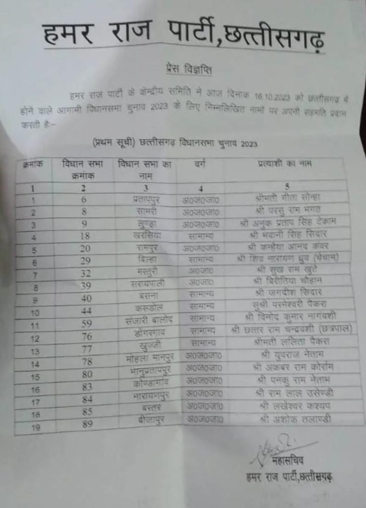 रायपुर/ पूर्व केंद्रीय मंत्री अरविंद नेताम द्वारा गठित हमर राज पार्टी ने विधान सभा चुनाव 2023 आम चुनाव के लिए प्रत्याशियों के19 नामों की सूची जारी की है । जिसमे भानुप्रतापपुर विधानसभा उपचुनाव निर्दलीय लड़े रिटायर्ड पुलिस अधिकारी(IPS) अकबर राम कोर्राम को भानुप्रतापपुर विधानसभा के लिए आज हमर राज पार्टी ने मैदान में उतारा है । वही अन्य 18 सीटो के लिए भी अपना प्रत्याशी आज घोषित किया है ।