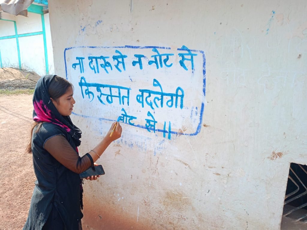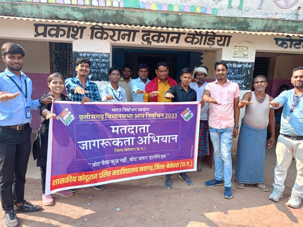 बेमेतरा जिला के नवागढ़ मुख्यालय में स्थित शासकीय कोदूराम दलित महाविद्यालय नवागढ़ में मंगलवार को सभी छात्र छात्राओं व महाविद्यालय स्टाफ के साथ नवागढ़ के मुख्य चौक चौराहों पर मतदान के प्रति लोगों को जागरूक करने के लिए रैली निकालकर अभियान चलाया जिसमे छात्र छात्राओं ने ना जाति पर ना धर्म पर बटन दबेगा कर्म पर जैसे नारे लगाकर जागरूकता अभियान चलाया फिर ग्राम कोडिया में पहुंचकर छात्र छात्राओं के साथ सरकारी संस्थाओं पर वाल पेंटिंग कर नए मतदाताओं को एवं ग्राम वासियों को सत प्रतिशत मतदान के लिए जागरुक करते हुए संदेश दिया गया जिसमें मुख्य रूप से राष्ट्रीय सेवा योजना के प्रभारी निर्मल कुमार छात्र नेता परमेश्वर पात्रे,शिखा गेडाम,साहिल,भागीरथी, अनिल, प्रशांत,तुलेश्वर,सुमित,चांदनी,किरन,मनीष वर्मा,महेश्वरी सहित बड़ी संख्या में छात्र छात्राओं मौजूद रहे अंत में छात्र नेता पात्रे ने जानकारी देते हुए कहा की प्रदेश में कुछ महीनो बाद ही विधानसभा चुनाव होने है जिसके लिए निष्पक्ष मतदान हो लोग अधिक से अधिक मतदान हो इसी उद्देश्य रैली निकाला गया है।