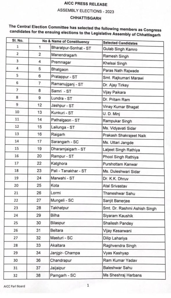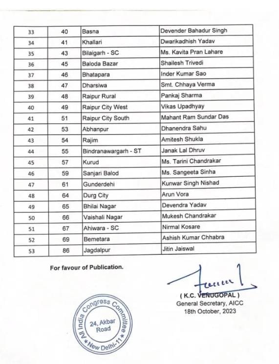 ब्रेकिंग न्यूज़ छत्तीसगढ़ विधान सभा चुनाव 2023 के लिए कांग्रेस ने दूसरी लिस्ट 53 विधानसभा क्षेत्र प्रत्याशियों की जारी की है । जिसमे जगदलपुर से जतिन जायसवाल …. Express MPCG Oct 18, 2023 0 रायपुर/ छत्तीसगढ़ विधान सभा चुनाव 2023 के लिए कांग्रेस ने दूसरी लिस्ट 53 विधानसभा क्षेत्र प्रत्याशियों की जारी की है । जगदलपुर से जतिन जायसवाल…. जतिन जायसवाल ….