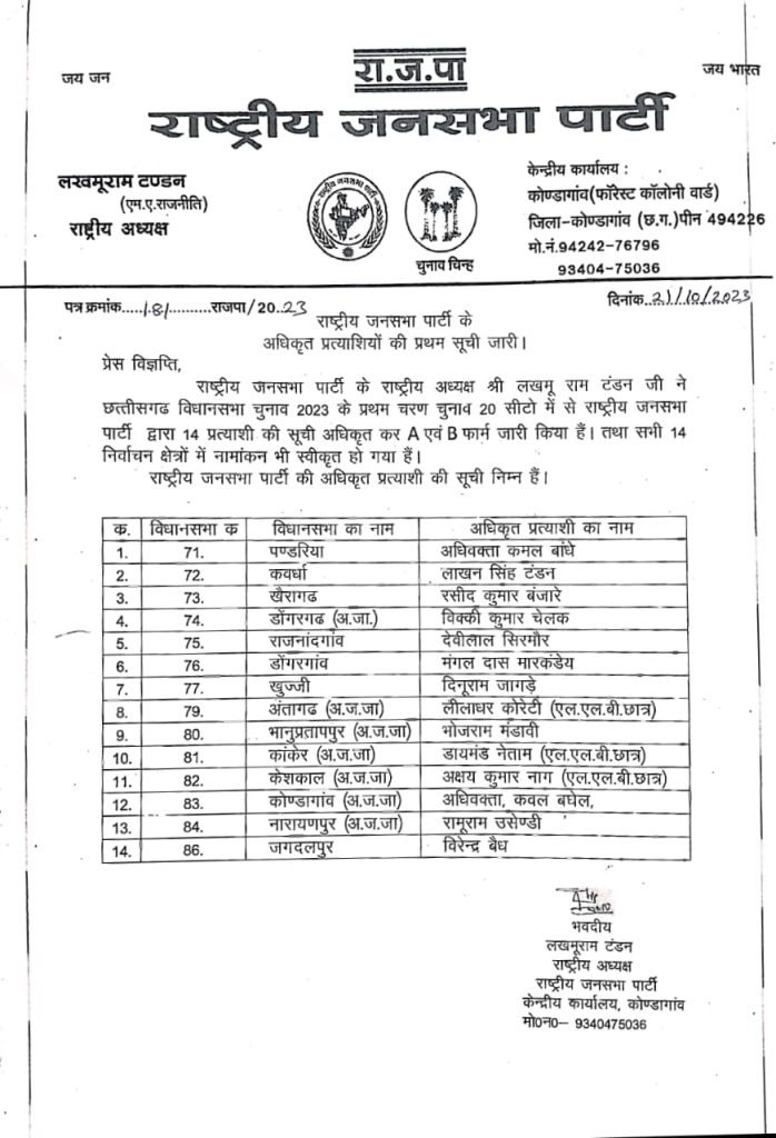 राष्ट्रीय जनसभा पार्टी के राष्ट्रीय अध्यक्ष श्री लखमू राम टंडन जी ने छत्तीसगढ विधानसभा चुनाव 2023 के प्रथम चरण चुनाव 20 सीटो में से राष्ट्रीय जनसभा पार्टी द्वारा 14 प्रत्याशी की सूची अधिकृत कर ए एवं बी फार्म जारी किया हैं तथा सभी 14 निर्वाचन क्षेत्रों में नामांकन भी स्वीकृत हो गया हैं। राष्ट्रीय जनसभा पार्टी की अधिकृत प्रत्याशी की सूची निम्नानुसार हैं।