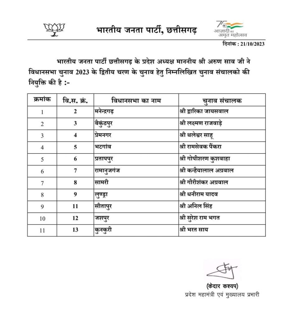 भारतीय जनता पार्टी ने विधानसभा चुनाव 2023 के दूसरे चरण के चुनाव के लिए चुनाव संचालकों की नियुक्ति की है. इस संबंध में भाजपा की ओर से सूची भी जारी की गई है. जिसमें 11 विधानसभा सीटों के लिए चुनाव संचालकों का नाम शामिल है. यह नियुक्ति बीजेपी प्रदेश अध्यक्ष अरुण साव ने की है