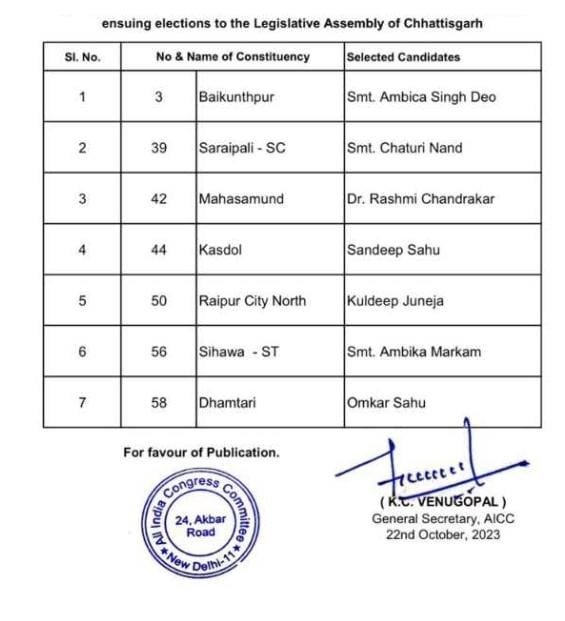 रायपुर/छत्तीसगढ़ विधान सभा चुनाव 2023 के लिए कांग्रेस ने अपने बचे हुई 7 विधानसभा क्षेत्रों के लिए प्रत्याशियों की घोषणा की है ।कांग्रेस ने घोषणा से बची 7 सीटों पर सिहावा से श्रीमती अम्बिका मरकाम, धमतरी से ओंकार साहू,महासमुंद से डॉ.रश्मि चंद्राकर, कशडोल से संदीप साहू, रायपुर शहर उत्तर से कुलदीप जुनेजा,सरायपाली से चतुरी नंद, बैकुंठपुर से श्रीमती अम्बिका सिंह देव को मैदान में उतारा है ।