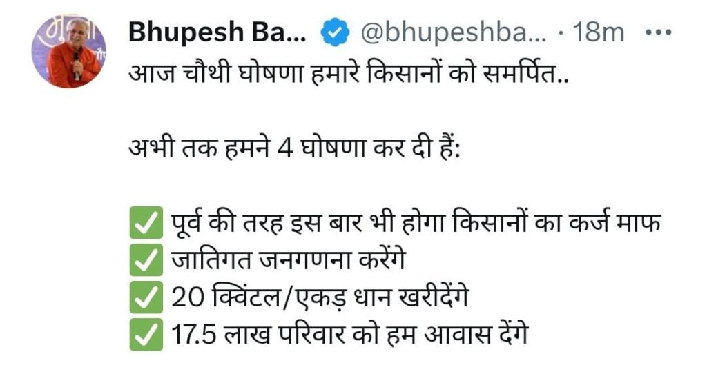 ब्रेकिंग न्यूज़ चुनावी घोषणा … छत्तीसगढ़ में कांग्रेस फिर से सरकार बनाएगी तो किसानों का कर्ज माफी की घोषणा सीएम भूपेश बघेल ने आज शक्ति में आयोजित जनसभा में की है । Express MPCG Oct 23, 2023 0 रायपुर/ छत्तीसगढ़ में कांग्रेस फिर से सरकार बनाएगी तो किसानों का कर्ज माफी की घोषणा सीएम भूपेश बघेल ने आज शक्ति में आयोजित जनसभा में की है । वहीं ट्वीटर में भी इसकी जानकारी भूपेश बघेल ने सार्वजनिक की है ।