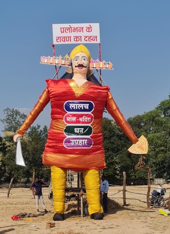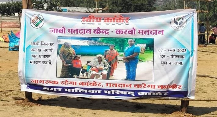कांकेर बुराई पर अच्छाई की जीत का पर्व विजयदशमी (दशहरा) का आयोजन आज शाम 5.30 बजे स्थानीय नरहरदेव स्कूल मैदान में किया गया। उक्त कार्यक्रम में मतदाता जागरूकता कार्यक्रम स्वीप का भी आयोजित किया गया, जिसमें रावण दहन के दौरान स्वीप वॉलिंटियर्स के द्वारा रावण को प्रलोभन का प्रतीक निरूपित करते हुए उपस्थित सभी लोगों को स्वविवेक से मतदान करने और किसी प्रकार के प्रलोभन में नहीं आने की अपील की गई। साथ ही आयोजन स्थल पर मौजूद लोगों से मोबाइल की फ्लैश लाइट जलवाकर एक साथ नारा लगाया- *जागरूक रहेगा कांकेर, मतदान करेगा कांकेर।* दर्शक के तौर पर उपस्थित सभी मतदाताओं ने यह नारा दोहराया और शत प्रतिशत वोट अनिवार्य रूप से करने का संकल्प भी लिया।