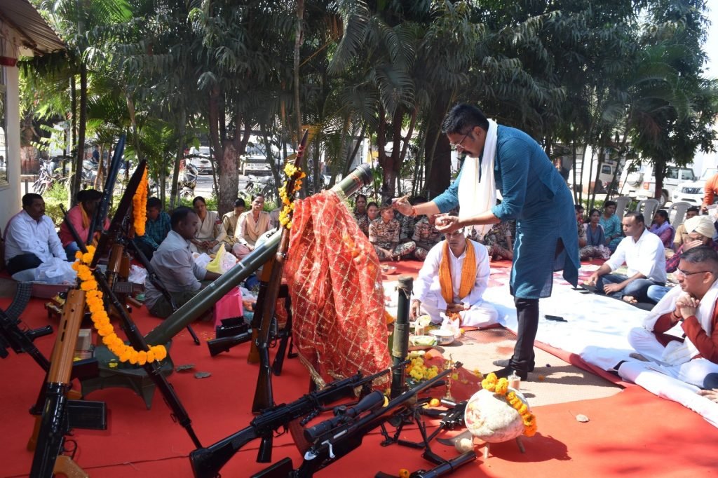जगदलपुर। विजयादशमी पर मंगलवार को रक्षित केंद्र में बस्तर पुलिस बल व समस्त सुरक्षा बल के सदस्यों तथा परिजनों की उपस्थिति में सुरक्षा एवं खुशहाली के लिए शस्त्र पूजन तथा मां दुर्गा व मां दंतेश्वरी की पूजा अर्चना की गई।