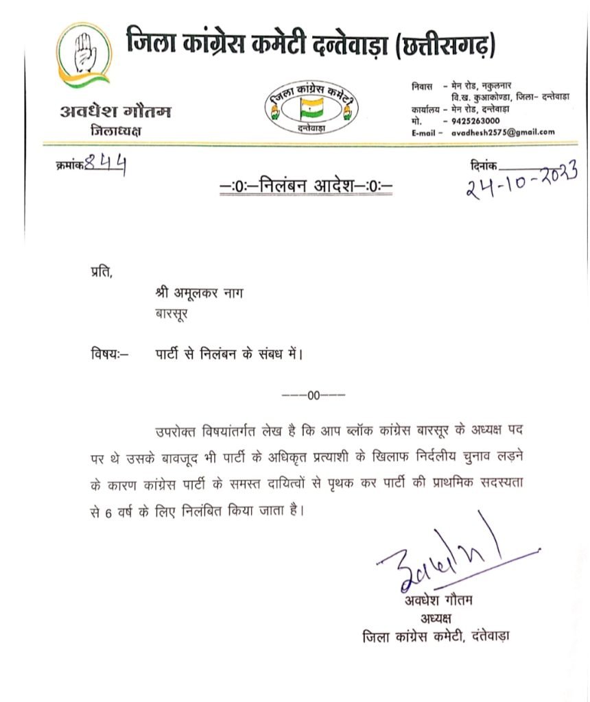 दंतेवाड़ा ज़िले के बारसूर ब्लॉक अध्यक्ष अमुलकर नाग को कांग्रेस के अधिकृत प्रत्याशी छविंद्र कर्मा के खिलाफ़ चुनाव लड़ने के कारण पार्टी के सभी दायित्वों से पृथक कर पार्टी की प्राथमिकता सदस्यता से छह वर्ष के लिए निलंबित किया गया है।