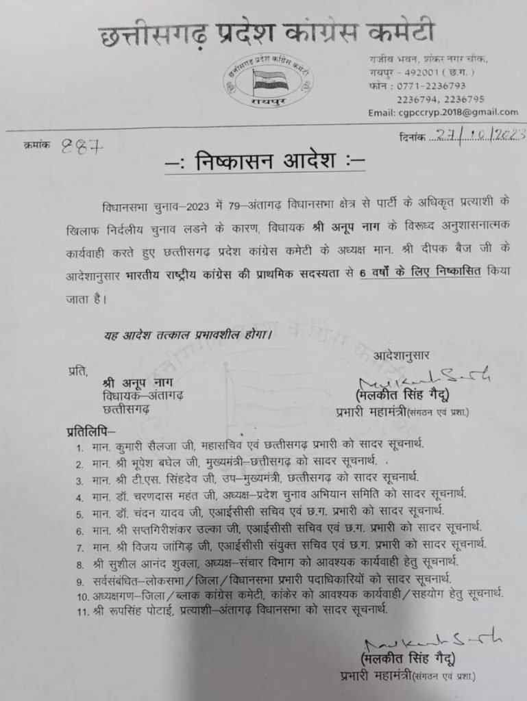 ब्रेकिंग न्यूज़ कांग्रेस से बगावत कर चुनाव लड़ रहे अनूप नाग को 6 वर्षो के लिए निष्कासित किया Express MPCG Oct 27, 2023 0 कांकेर/ अंतागढ़ के मौजूदा कांग्रेसी विधायकअनूप नाग जो कि निर्दलीय चुनाव लड़ रहे ,उन्हे कांग्रेस पार्टी ने 6 वर्षो के लिए पार्टी से निष्कासित किया ।