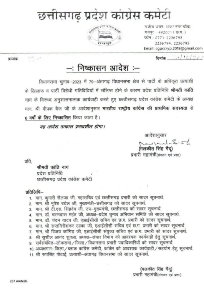 कांकेर/ अंतागढ़ विधान सभा सीट पर कांग्रेस से बागी होकर निर्दलीय चुनाव लड़ रहे अनूप नाग की पत्नी कांति नाग (कांग्रेस प्रदेश प्रतिनिधि) को भी पार्टी विरोधी गतिविधियों में संलिप्तता के आरोप में कांग्रेस पार्टी ने प्राथमिक सदस्यता से6 वर्षो के लिए निष्कासित किया । इससे पहले कल ही अनूप नाग का निष्कासन किया गया है ।